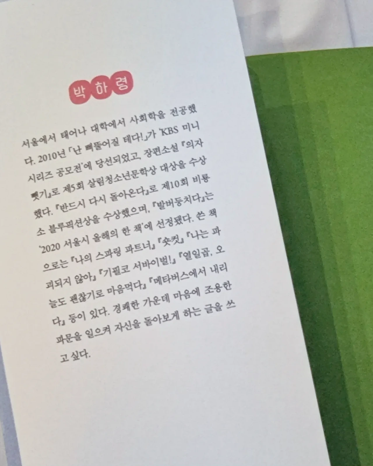 - 박하령 작가님의 소설은 청소년 소설이지만, 향수를 일으키는 성장 소설이라고 생각한다. 그래서 나는 박하령 작가님의 소설을 사랑한다. <한판 붙을 결심>은 4가지의 단편 소설을 묶은 소설집인데, 첫 소설이 바로 <한판 붙을 결심>이다. 시작부터 끝까지 그녀의 소설엔 살아있는 그녀들의 이야기가 담겨있다.