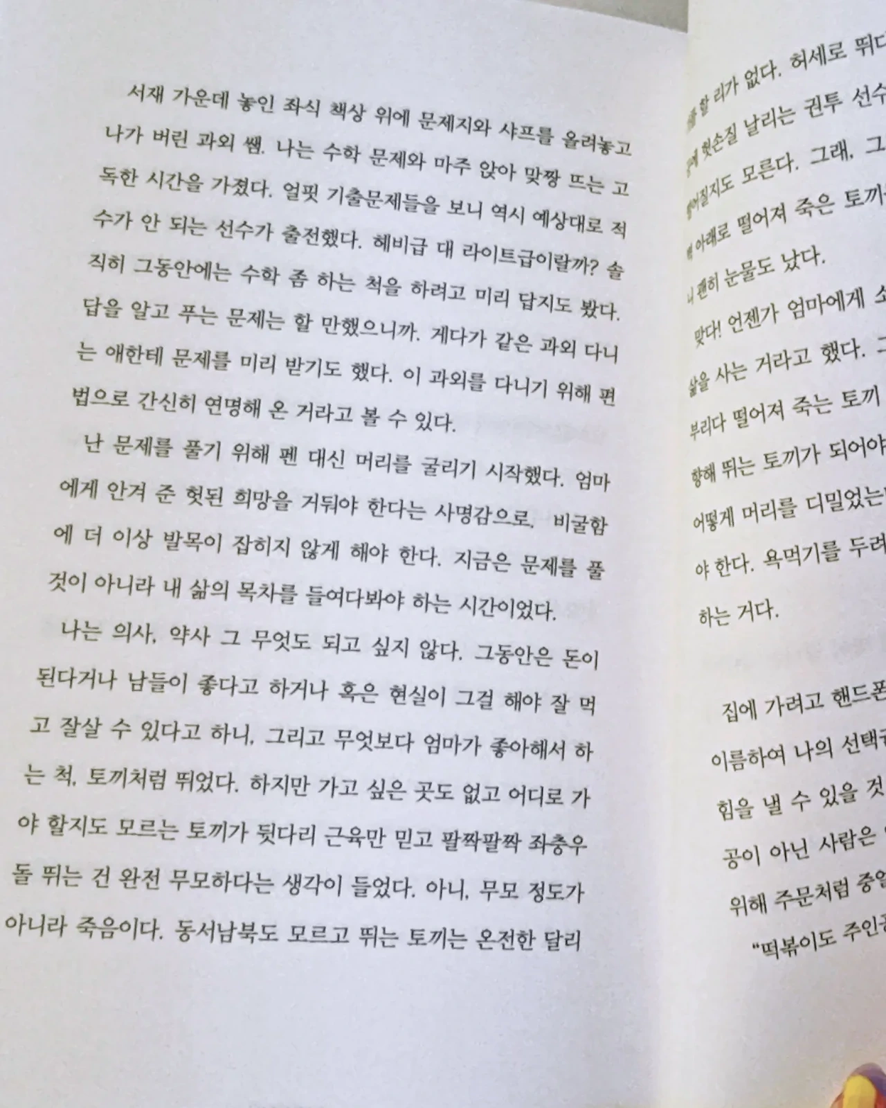 나는 의사, 약사 그 무엇도 되고 싶지 않다. 그동안은 돈이 된다거나 남들이 좋다고 하거나 혹은 현실이 그걸 해야 잘 먹고 잘 살수 있다고 하니, 그리고 무엇보다 엄마가 좋아해서 하는 척, 토끼처럼 뛰었다. 하지만 가고 싶은 곳도 없고 어디로 가야 할지도 모르는 토끼가 뒷다리 근육만 믿고 팔짝팔짝 좌충우돌 뛰는 건 완전 무모하다는 생각이 들었다. 아니, 무모 정도가 아니라 죽음이다. p.160