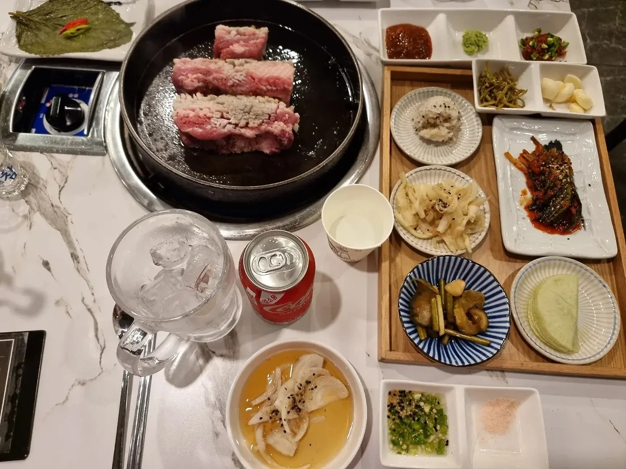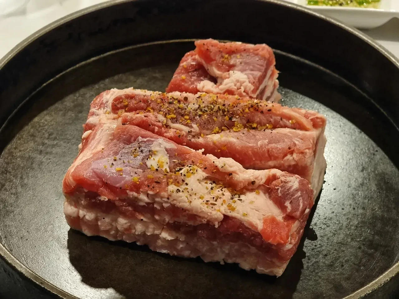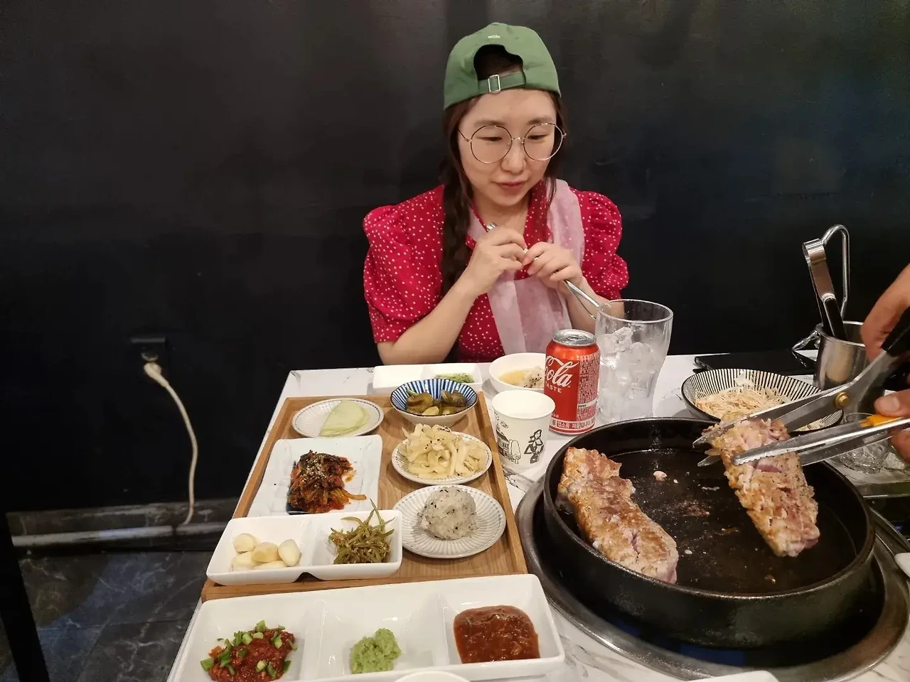 - 무더운 여름 날에 고기를 구워 먹기란 쉽지않다. 구워 먹을 용기가 필요한데, 나의 단골집인 눈꽃을 나누다는 사장님이 직접 고기를 구워 주신다. 칼집이 촘촘하게 난 두툼한 돼지고기를 뜨거운 후라이팬에 굽는다. 거기에 부추부침과 백김치를 같이 구워서 먹는다. 특이한 점은 이곳에는 배추김치가 메뉴로 나오지 않고 백김치가 나오고, 삼겹 초밥을 만들어 먹을 수 있는 밥이 나온다. 잘 구워진 삼겹살과 초밥, 백김치를 함께 올리고 젓갈과 와사비를 올려먹으면 군침이 절로 돈다. 뜨거운 여름 밤에 직접 고기를 구워 먹기란 쉽지 않지만, 이곳은 사장님이 직접 구워 주시니 삼겹살이 노릇노릇하게 굽는 과정을 보는 즐거움도 있다. 올 여름은 구워먹기보다 구워주는 고기 집을 찾아가 보자.