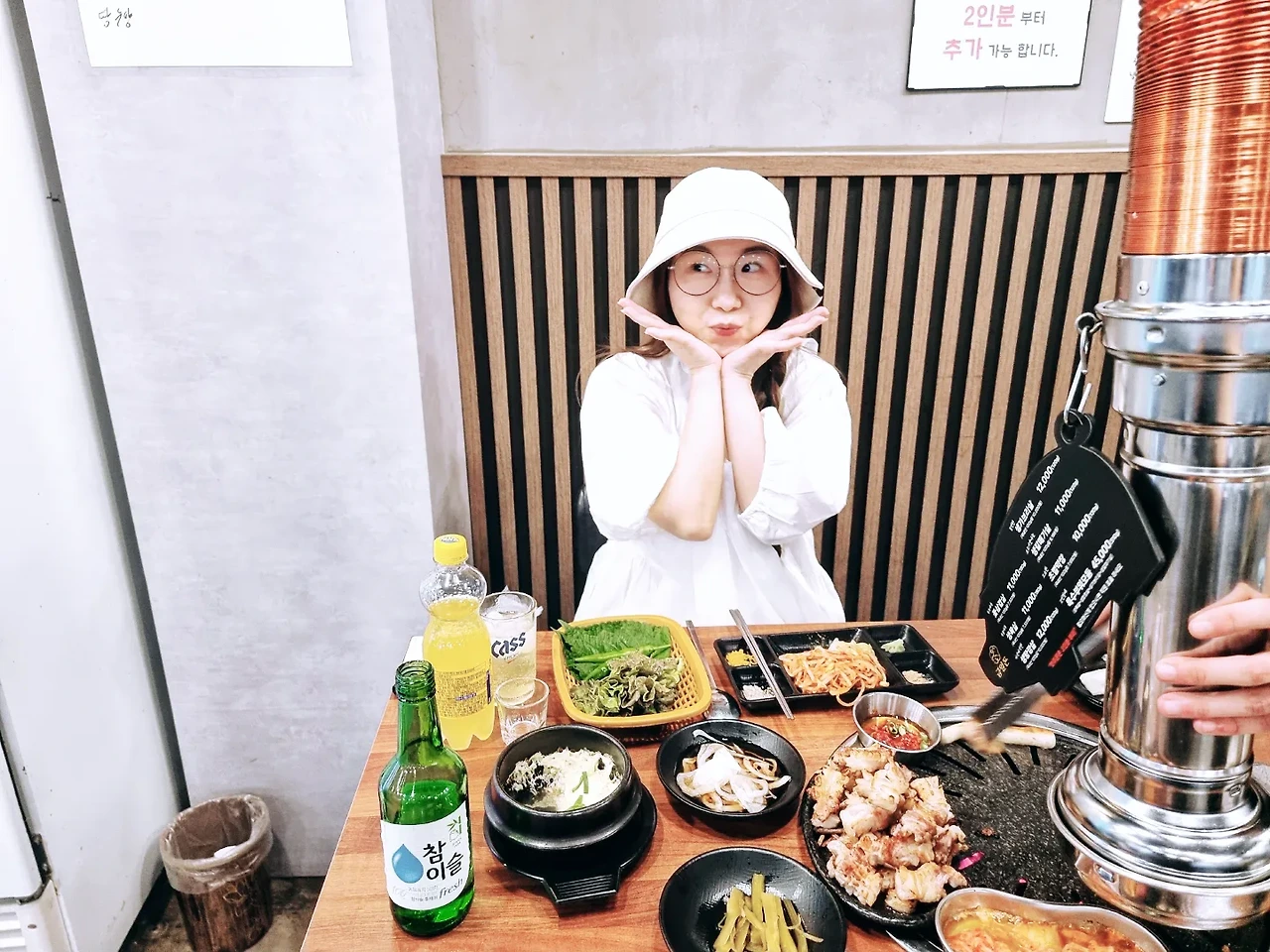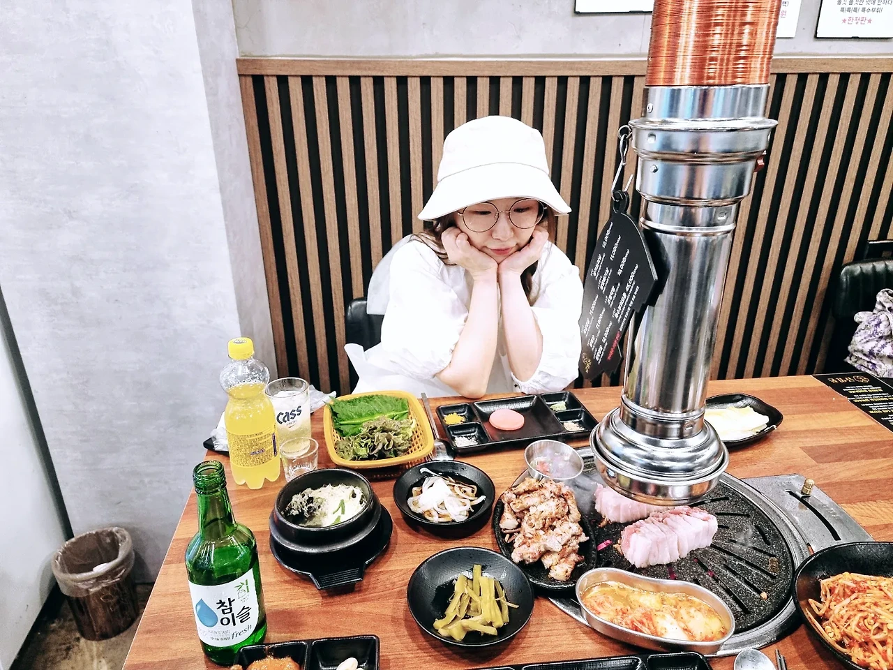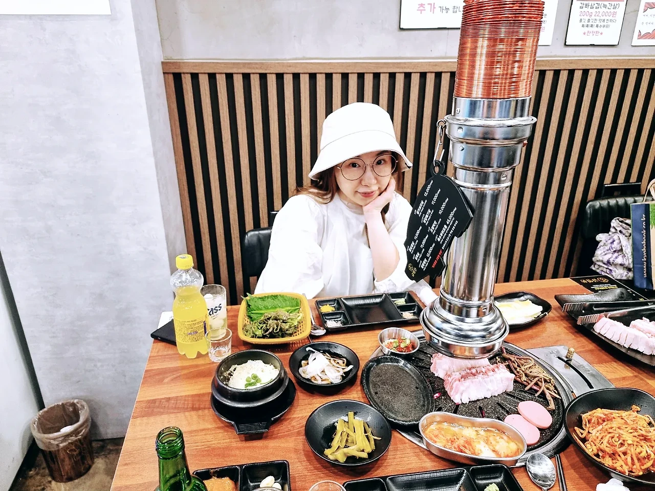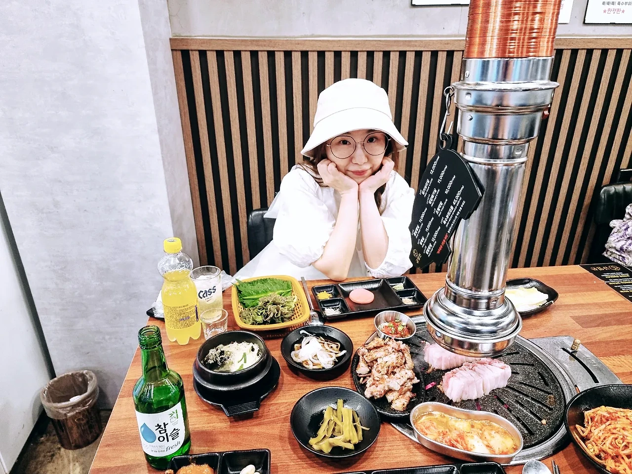 - 고기를 먹을 때는 어두운 색이나 편한 옷을 입는다. 그 날은 예상치 못한 상황이어서 몇년만에 흰색 옷을 입고 삼겹살을 먹었다. 화이트색 원피스에 기름이 튀면 노란 점이 되고, 양념이 튀기면 상상만 해도 찌릿한데, 그날은 앞치마로 무장하고 고기 만찬을 즐겼다. 요즘은 고기를 직접 구워 주는 곳이 곳곳에 생겨서 조금은 덜 부담을 갖고 갔는데, 이곳 또한 숨은 맛집이었다. 도톰한 돼지삼겹에 잘게 칼집이 된 통삼겹을 사장님이 구워주셨다. 구운 삼겹에 구운 고사리와 김치를 올리고, 거기다 와사비를 한점 해서 먹으면 생각만 해도 군침이 도는 맛_ 반찬 가지 수가 많은 편은 아니지만, 맛의 포인트는 있었다. 고기와 싸먹었던 젓갈은 이름이 가물한데, 기름진 삼겹살과 환상적인 궁합이었다. 더불어 여름에는 물냉면을 많이 먹지만, 그날은 왠일인지 비빔냉면이 당겨서 부캐는 비빔냉면으로 마무리 했는데 계란 지단과 매운 양념이 절묘하게 섞이고, 살얼음 냉육수가 최고의 조합을 이루어 맛있는 만찬이 완성되었던 날.