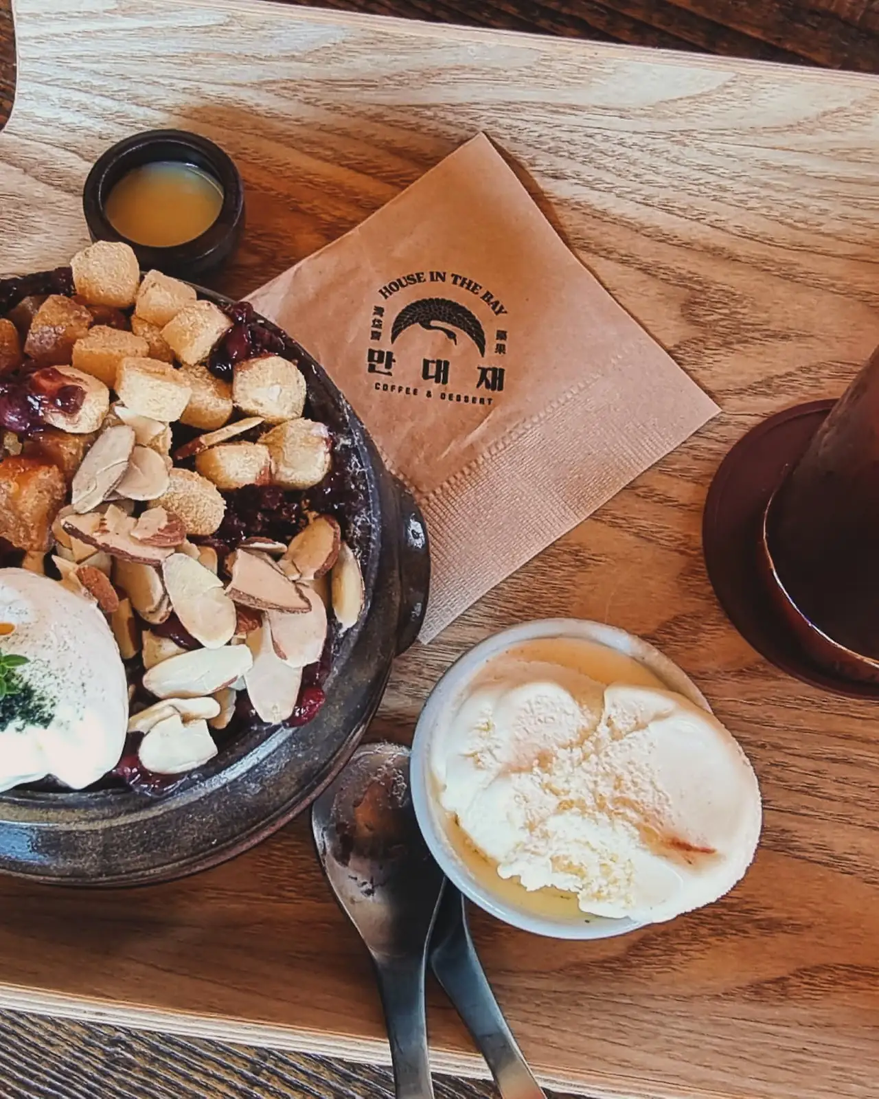 - 여행자로서 또 하나의 행복은 맛있는 디저트를 만나는 일. 맑은 가을 하늘을 보고 다시 생각나는 맛, 순천에서 만난 최고의 디저트, 항아리 빙수다. 잘 갈려진 우유 빙수에다 떡과 팥, 아몬드, 바닐라 아이스크림, 거기다 항아리 빙수의 가장 큰 맛의 핵심은 쫀듯한 수제 약과다. 옛스럽지만 고풍스러운 한옥미와 항아리 모양의 빙수 그릇, 그림같은 창가의 풍경들, 순천만의 철새인 흑두루미가 그려진 그림 액자, 입구에 마련된 한옥 정자, 그 모든 것이 선명하게 기억되는 그날의 맛, 그립고 또 그립다.