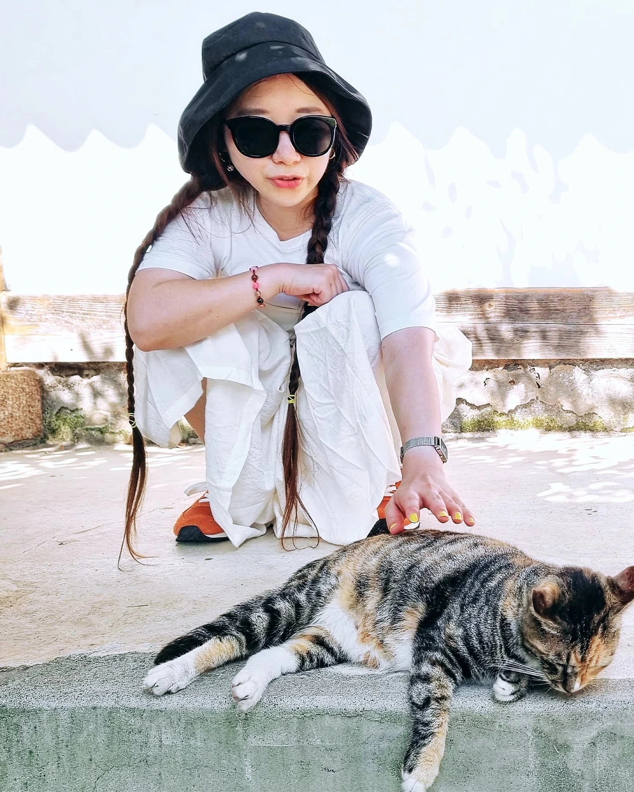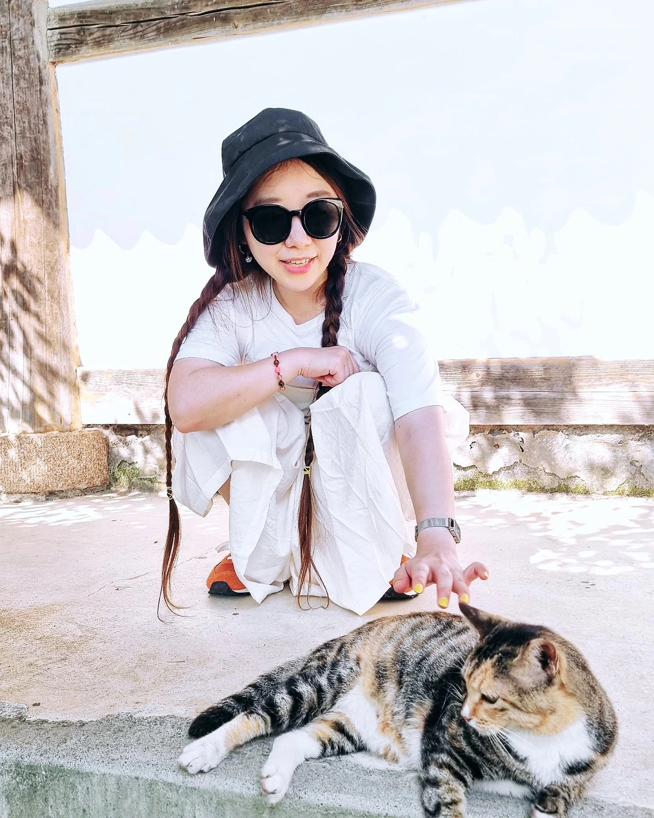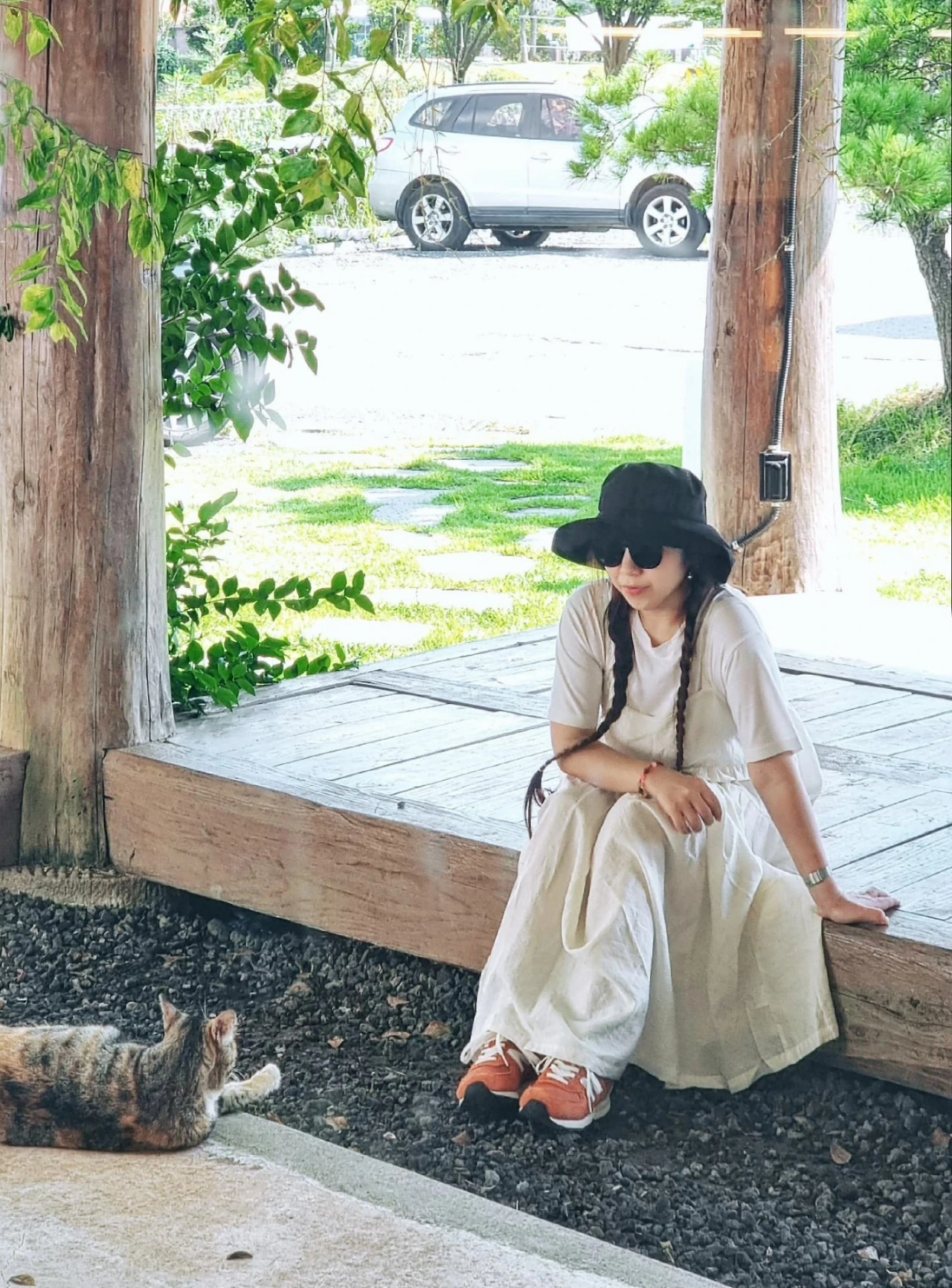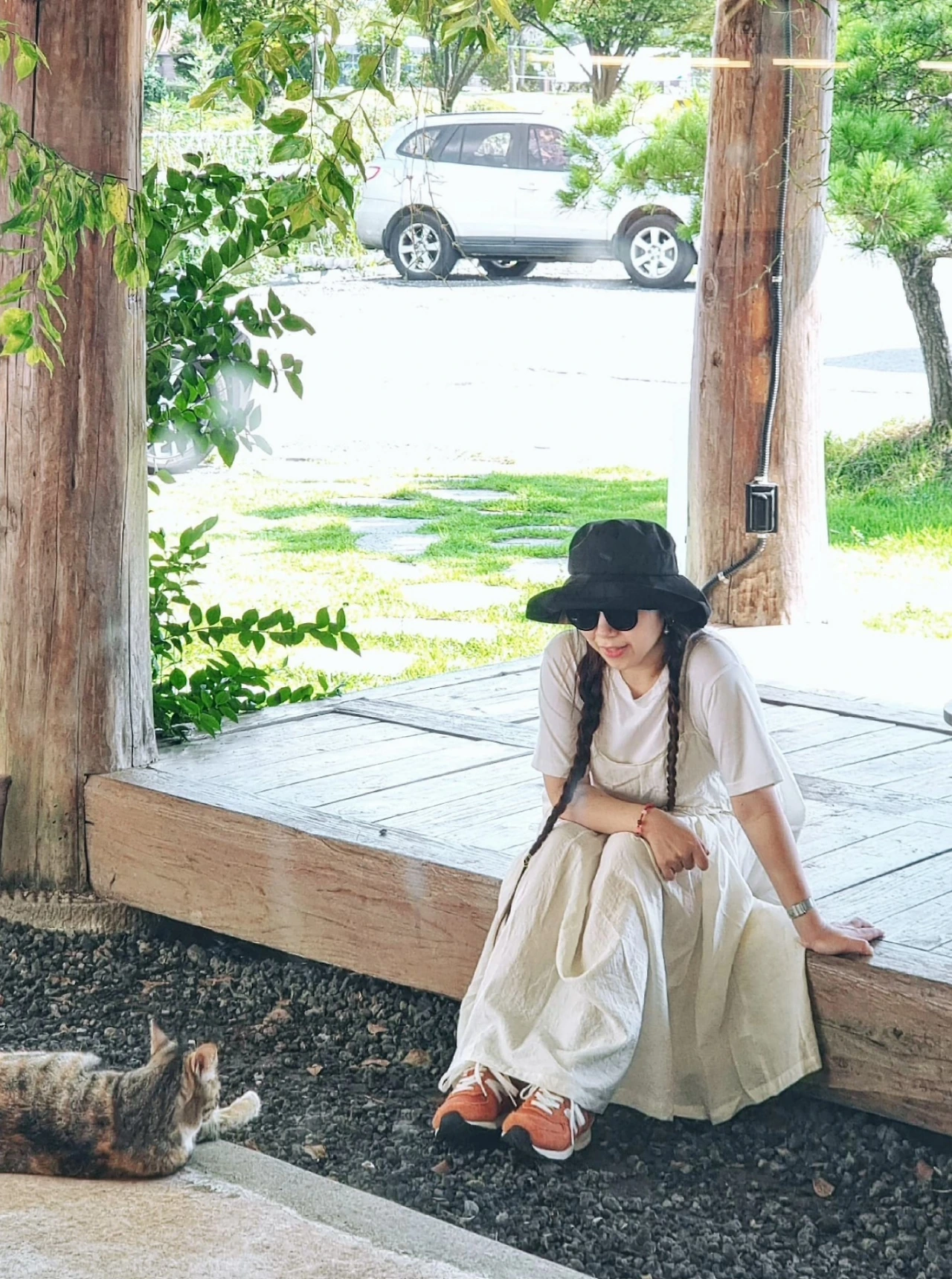 - 순천만의 하늘과 바람과 자연과 풍경에 마음이 풍성해졌고 사랑하는 한옥 카페를 만나 기분이 좋아지는 날이었다. 그러다 디저트를 기다리면서 설레는 마음으로 유리창밖을 바라보는데 느긋하게 휴식을 취하는 고양이를 발견하곤 살포시 밖으로 나갔다. 깔끔한데 옛스러운 정자에 앉아 고양이와 거리를 두고 천천히 냥에게 다가갔다. 5초 정도의 여유를 두고 고양이와 거리 교감을 한다. 그렇게 '나는 나쁜 인간이 아니란다.' 를 알리고 눈을 지긋이 바라보았다. 냥이는 경계심을 풀고 손발로 내게 인사한다. 고양이와 친해지고 싶은 때는 적절한 거리와 시간이 필요하다. 강아지와는 다른 성향을 가지고 있기에 천천히, 느리게 마음을 연다. 덕분에 참 행복했어. 잘 지내지? 만대재 고양이