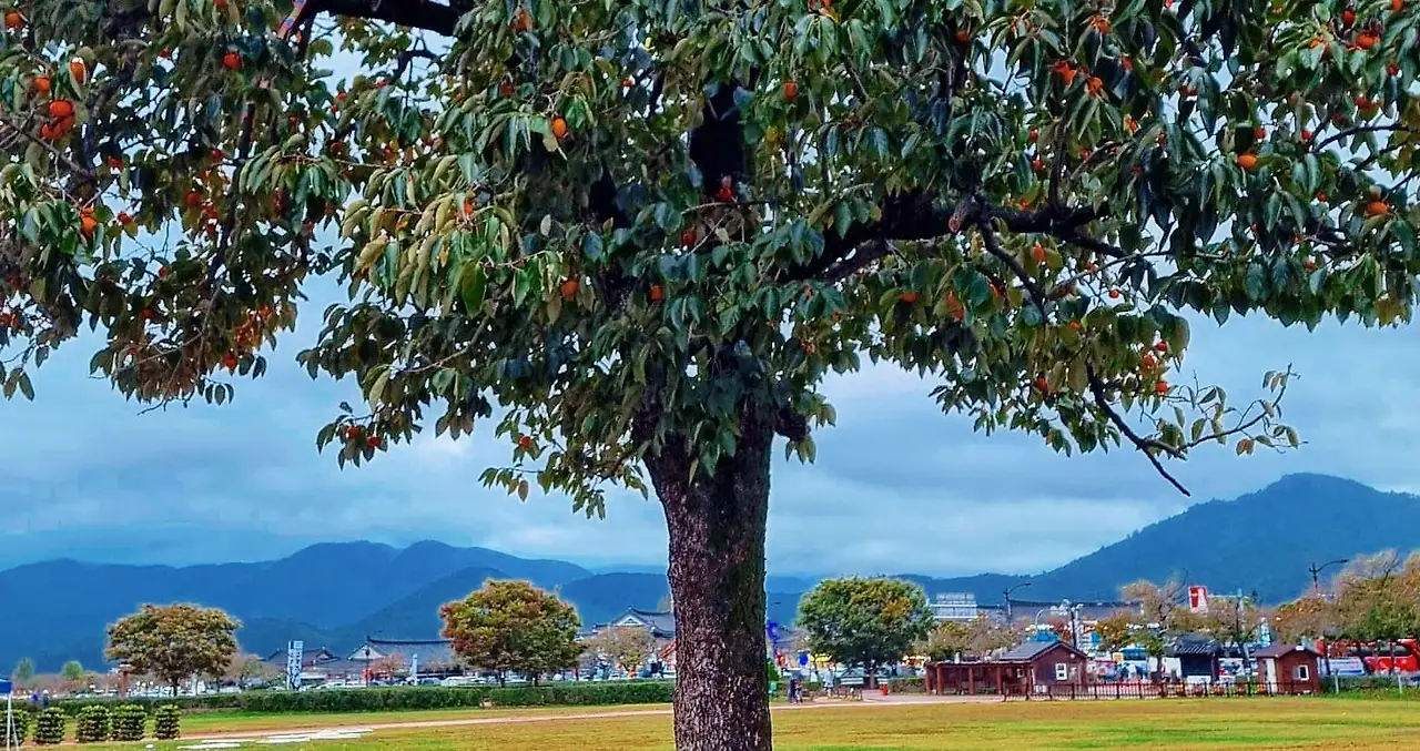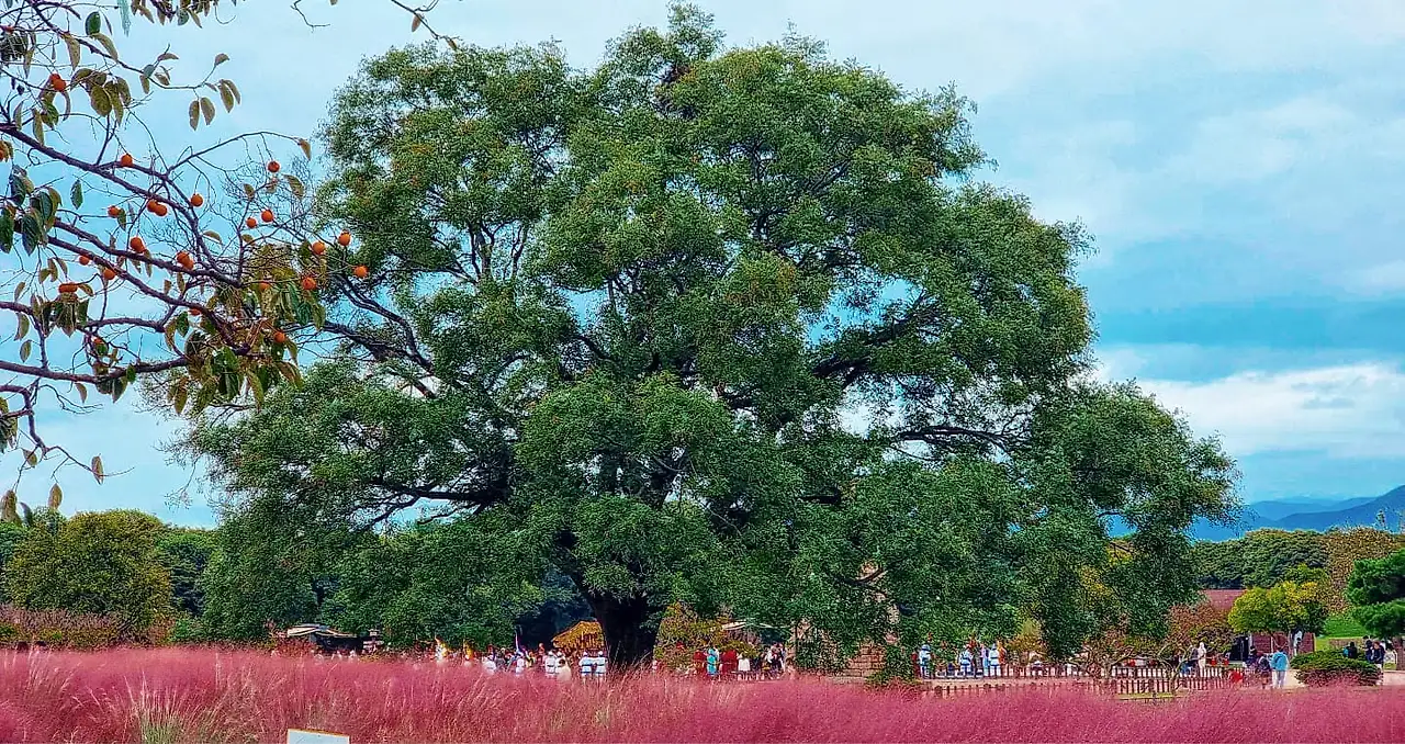 핑크빛으로 물들어가는 경주의 가을 이었다. 거대한 푸른 나무 뒤에는 첨성대가 더 있다. 경주 곳곳의 감나무들은 감들이 주렁 주렁 열려있고 가을의 색으로 옷을 갈아입는 자연의 풍경에 감탄하며 경주의 가을을 담는다.