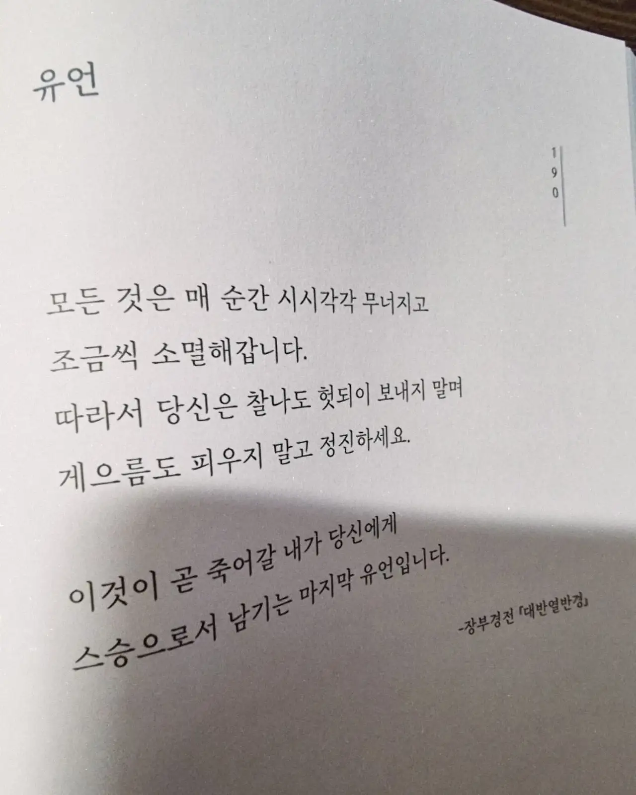 모든 것은 매 순간 시시각각 무너지고 조금씩 소멸해 갑니다. 따라서 당신은 찰나도 헛되이 보내지 말며 게으름도 피우지 말고 정진하세요. p.239 [유언]