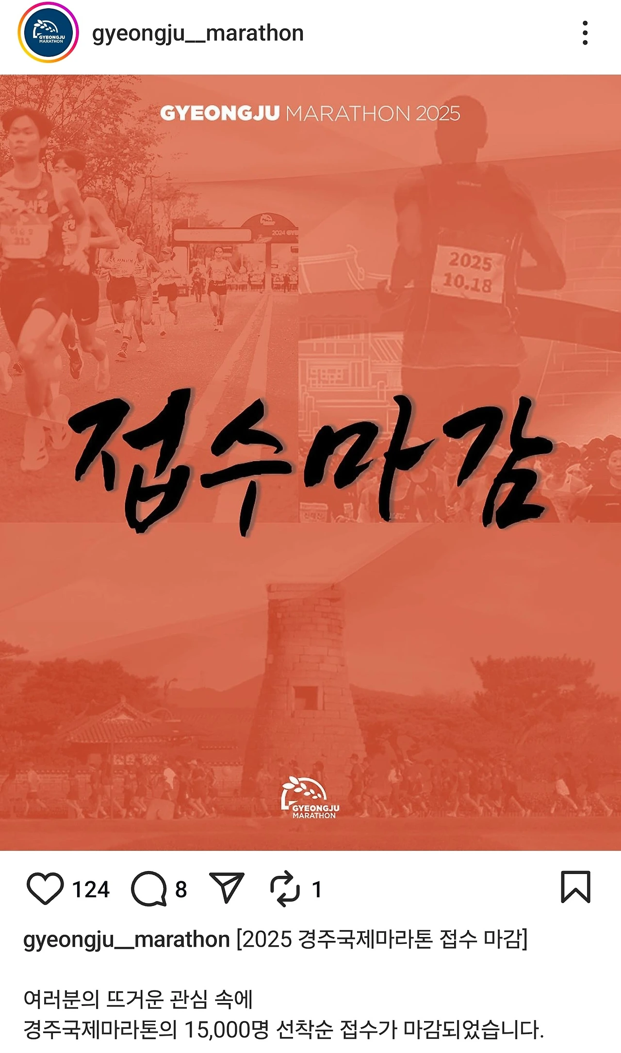 2025 경주국제마라톤무사히 10km 접수 성공!경주국제마라톤은 접수부터가경쟁이 치열해서접수 성공하면 운수 좋은 날부디 당신의 오늘도행운이 가득 하기를오늘보다 더 행복한내일이 되기를 믿어요.
