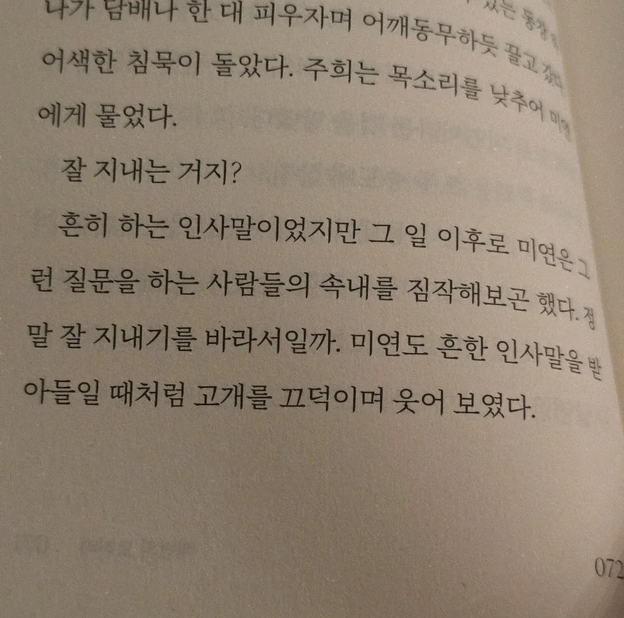 잘 지내는 거지? 흔히 하는 인사말이었지만 그 일 이후로 미연은 그런 질문을 하는 사람들의 속내를 짐작해보곤 했다. 정말 잘 지내기를 바라서 일까. 미연도 흔한 인사말을 받아들일 때처럼 고개를 끄덕이며 웃어 보였다. p.72