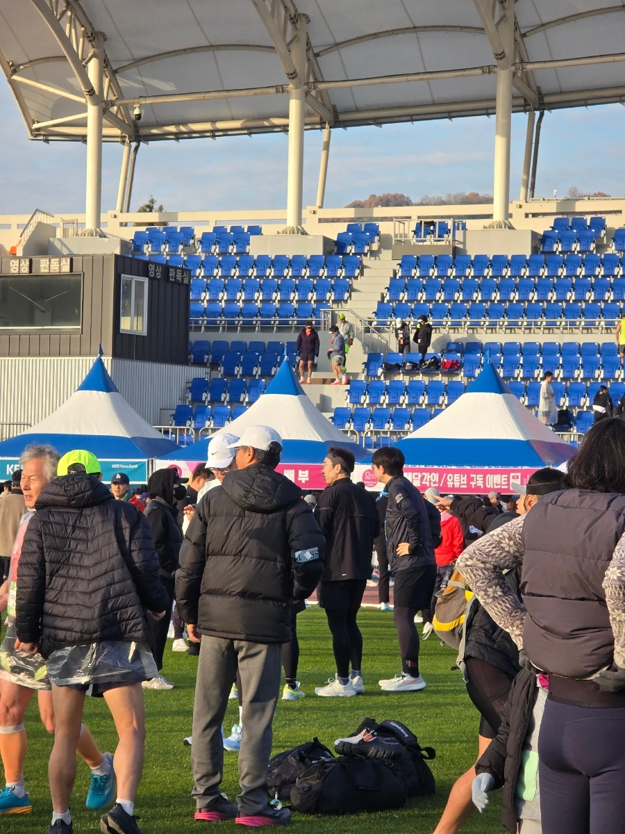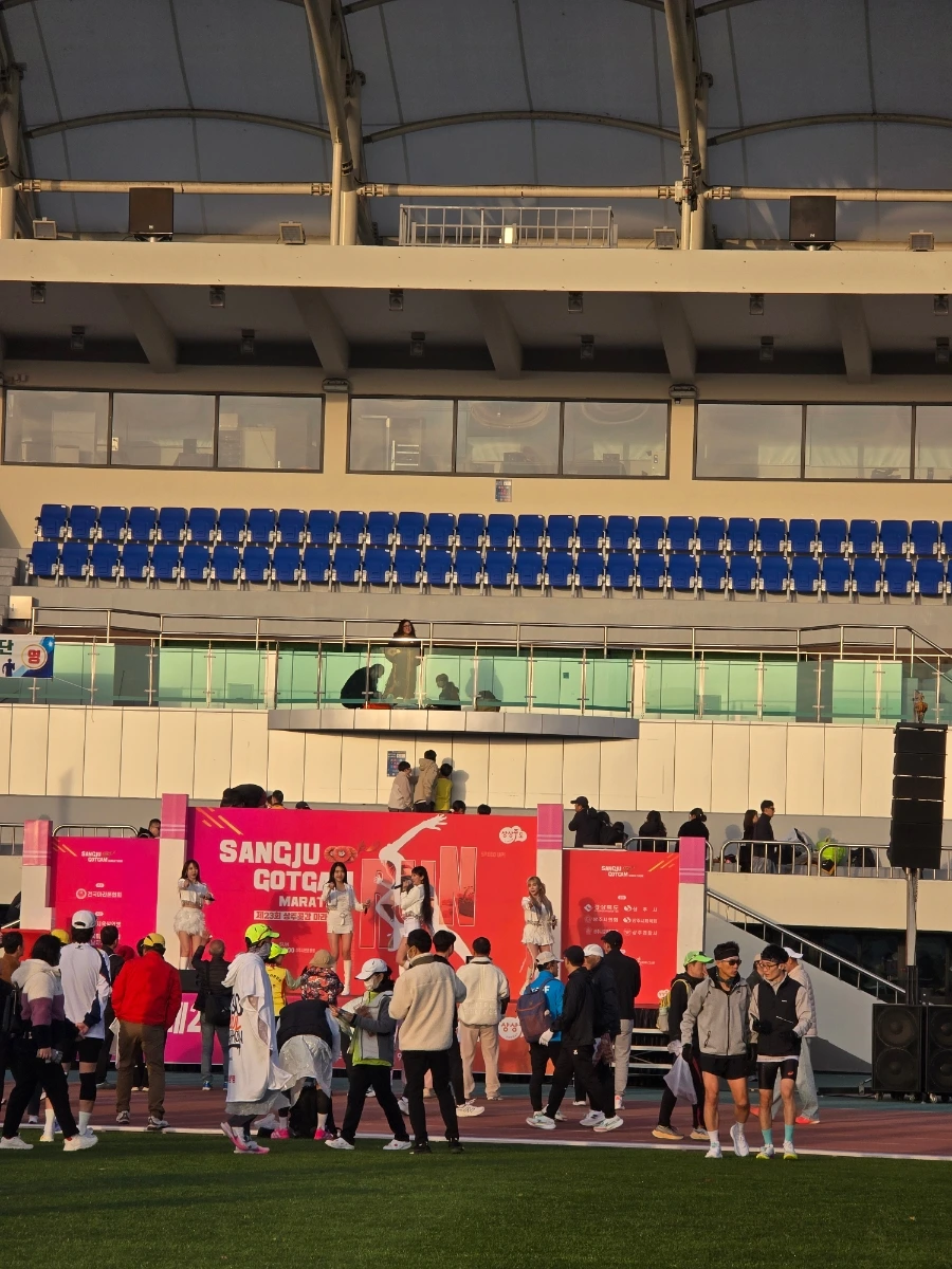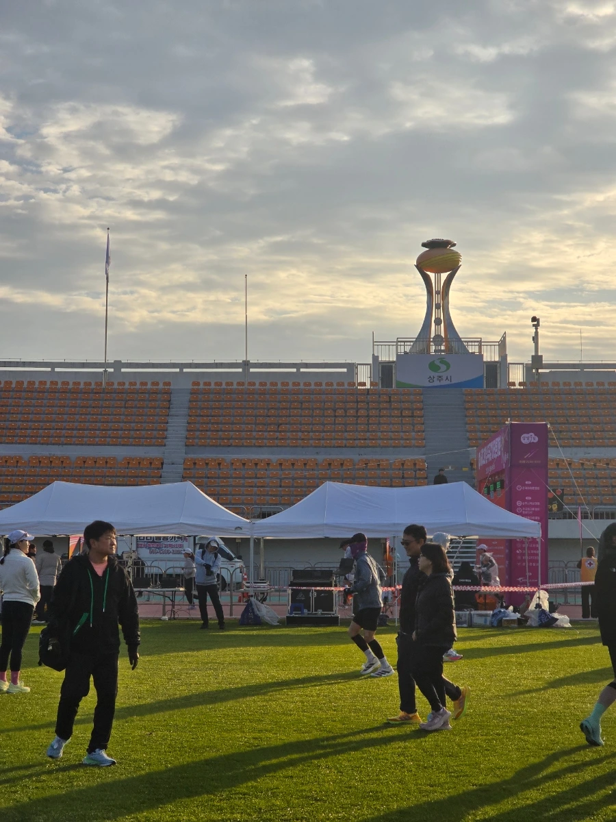 상주의 아침은 고요했다. 삼삼오오 전국의 러너들의 차로 상주시민운동장이 가득 메워지고 어느덧 고요함이 뜨거움으로 불붙었다. 맑은 날의 가을 아침이었다. 가을바람이라고는 생각되지 않는 찬 바람이 불어와 온몸을 움크렸지만 역대급 사람들의 분주함과 큰 규모에 다시금 온몸이 데워졌다. 이른 아침 도착해서 마라톤 부스를 돌아보는 재미도 쏠쏠한데 날씨가 추워서