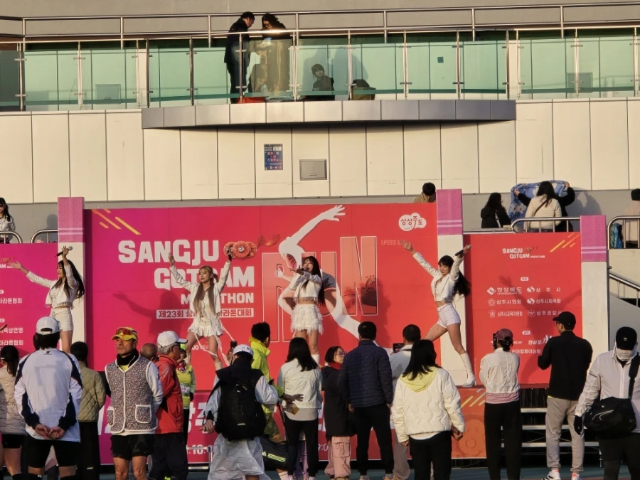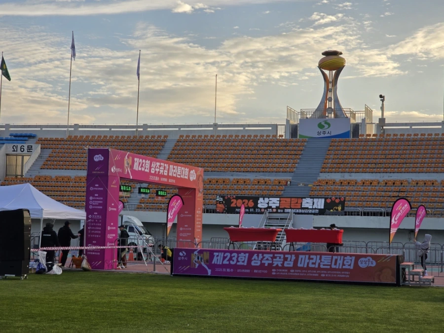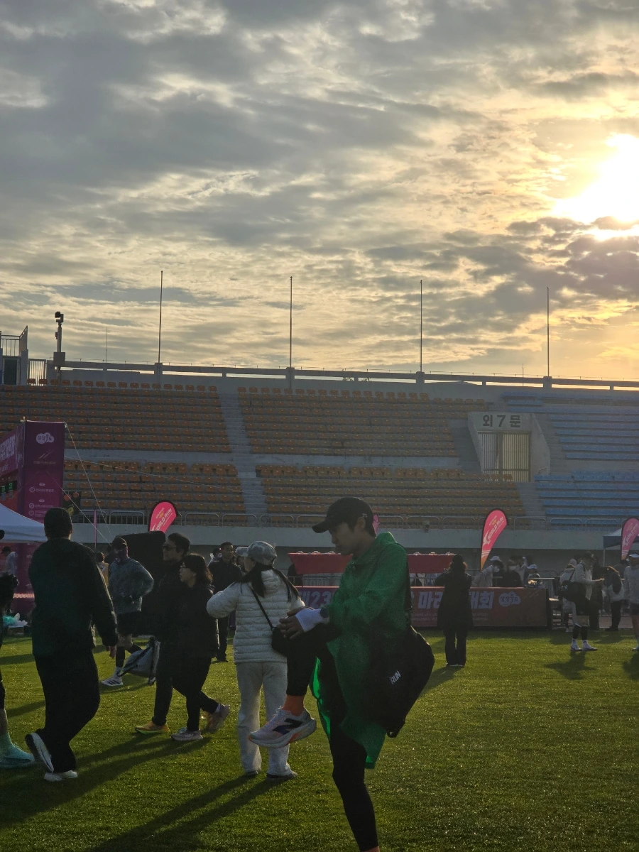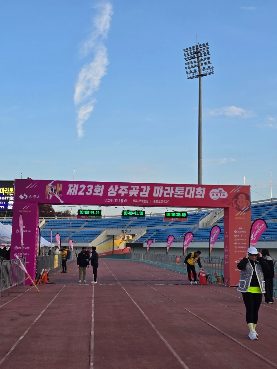 상주의 아침은 고요했다. 삼삼오오 전국의 러너들의 차로 상주시민운동장이 가득 메워지고 어느덧 고요함이 뜨거움으로 불붙었다. 맑은 날의 가을 아침이었다. 가을바람이라고는 생각되지 않는 찬 바람이 불어와 온몸을 움크렸지만 역대급 사람들의 분주함과 큰 규모에 다시금 온몸이 데워졌다. 이른 아침 도착해서 마라톤 부스를 돌아보는 재미도 쏠쏠한데 날씨가 추워서