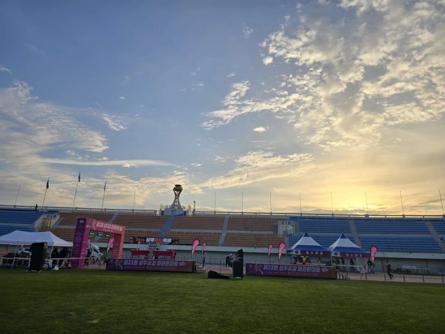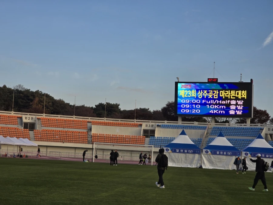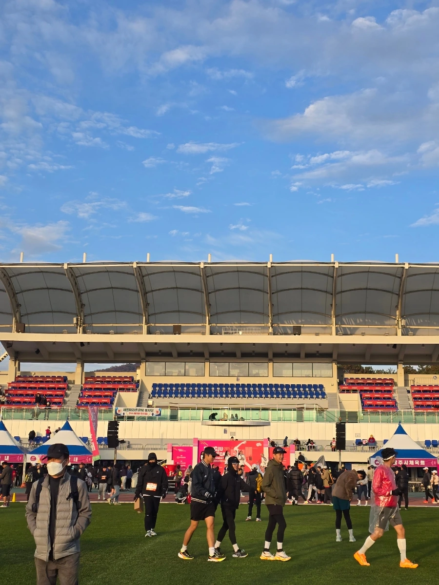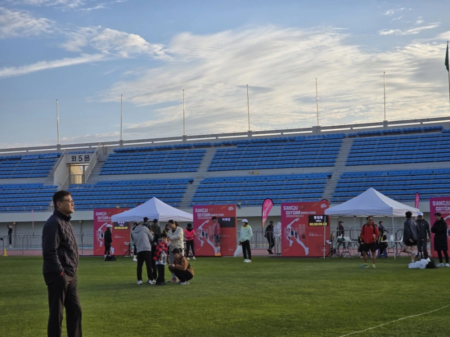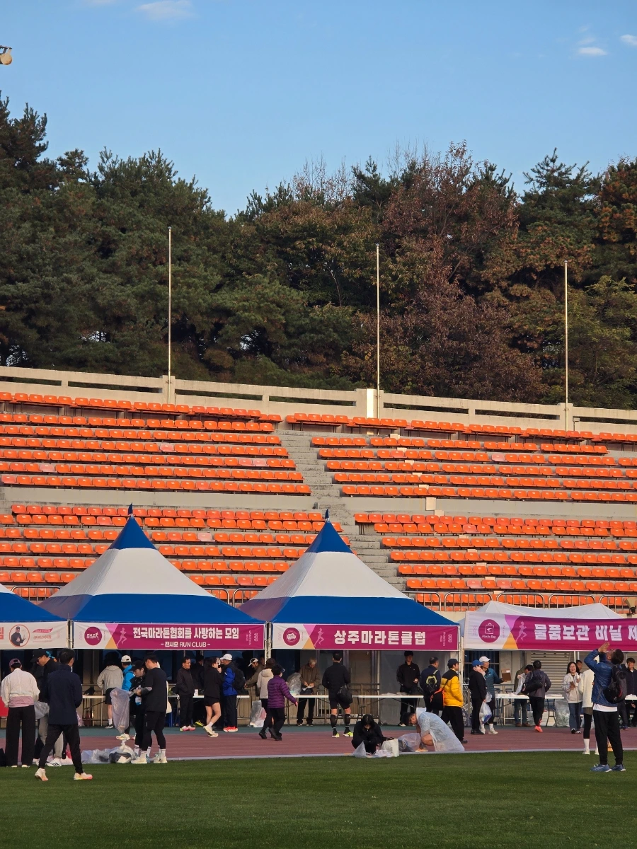 상주의 아침은 고요했다. 삼삼오오 전국의 러너들의 차로 상주시민운동장이 가득 메워지고 어느덧 고요함이 뜨거움으로 불붙었다. 맑은 날의 가을 아침이었다. 가을바람이라고는 생각되지 않는 찬 바람이 불어와 온몸을 움크렸지만 역대급 사람들의 분주함과 큰 규모에 다시금 온몸이 데워졌다. 이른 아침 도착해서 마라톤 부스를 돌아보는 재미도 쏠쏠한데 날씨가 추워서