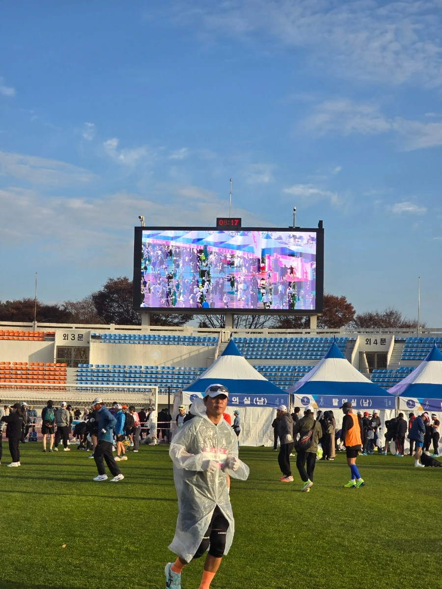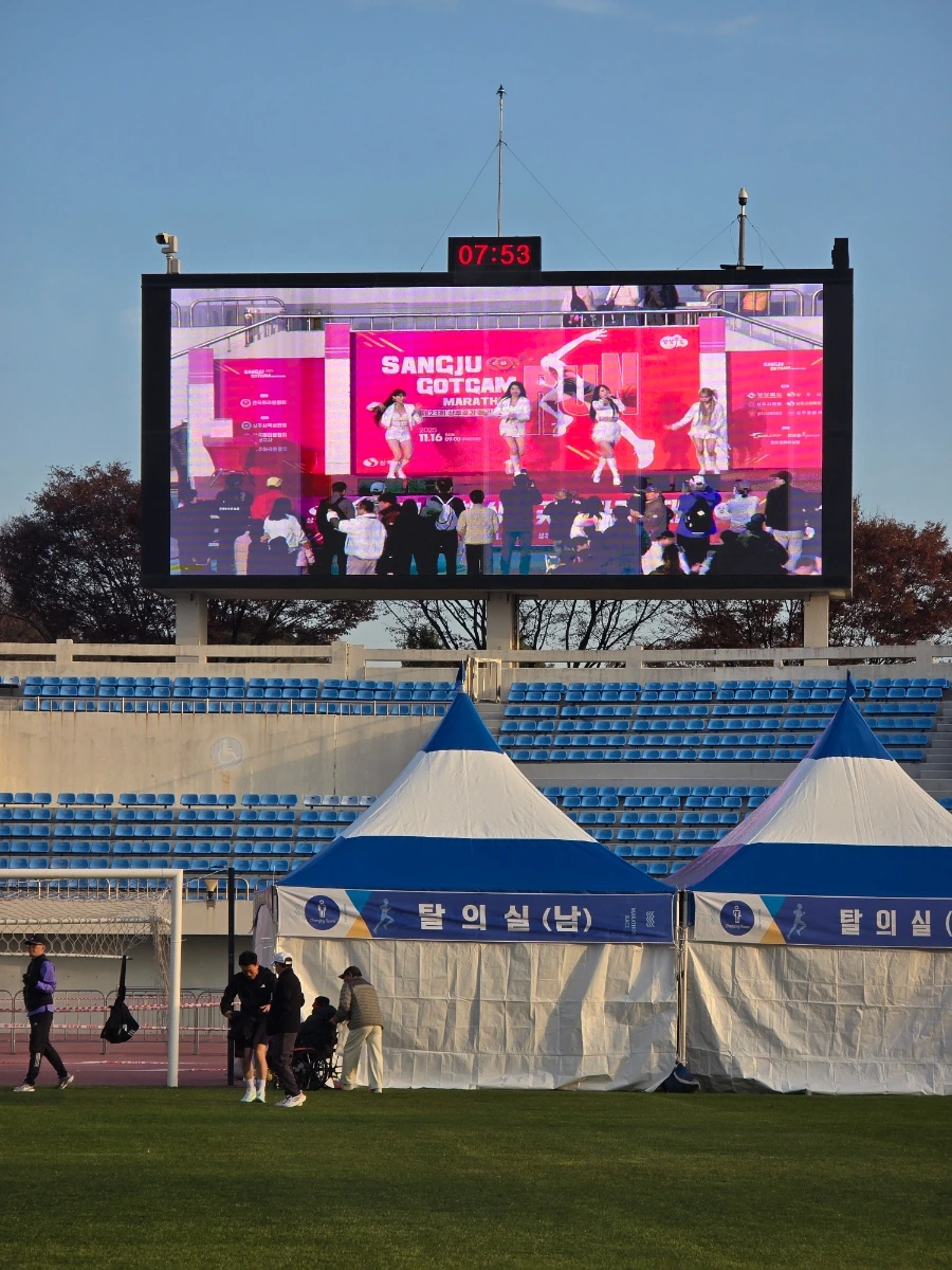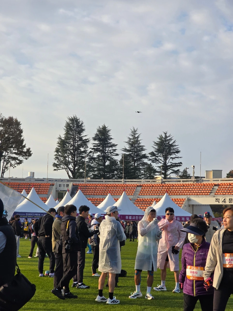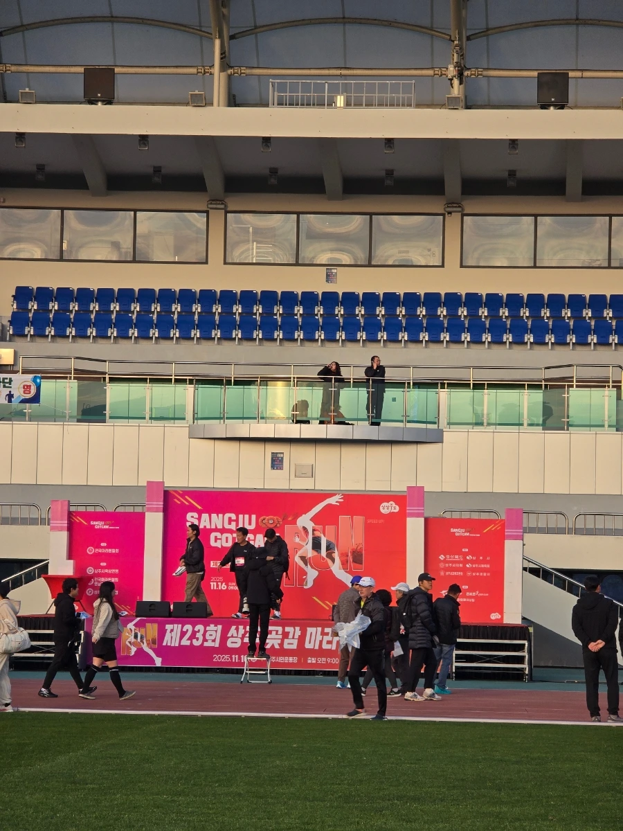 상주의 아침은 고요했다. 삼삼오오 전국의 러너들의 차로 상주시민운동장이 가득 메워지고 어느덧 고요함이 뜨거움으로 불붙었다. 맑은 날의 가을 아침이었다. 가을바람이라고는 생각되지 않는 찬 바람이 불어와 온몸을 움크렸지만 역대급 사람들의 분주함과 큰 규모에 다시금 온몸이 데워졌다. 이른 아침 도착해서 마라톤 부스를 돌아보는 재미도 쏠쏠한데 날씨가 추워서