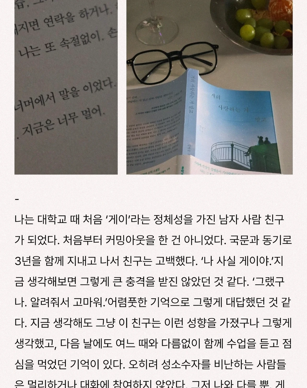 나는 대학교 때 처음 ‘게이’라는 정체성을 가진 남자 사람 친구가 되었다. 처음부터 커밍아웃을 한 건 아니었다. 국문과 동기로 3년을 함께 지내고 나서 친구는 고백했다. ‘나 사실 게이야.’지금 생각해보면 그렇게 큰 충격을 받진 않았던 것 같다. ‘그랬구나. 알려줘서 고마워.’어렴풋한 기억으로 그렇게 대답했던 것 같다. 지금 생각해도 그냥 이 친구는 이런 성향을 가졌구나 그렇게 생각했고, 다음 날에도 여느 때와 다름없이 함께 수업을 듣고 점심을 먹었던 기억이 있다. 오히려 성소수자를 비난하는 사람들은 멀리하거나 대화에 참여하지 않았다. 그저 나와 다를 뿐. 게이 친구를 멀리할 이유는 없었다. 그리고 그 이후부터 소설이나 영화 속에 ‘게이’나 성소수자들에 대한 내용이 나오면 편견없이 보게되었던 것 같다. 지금도 마찬가지다. 소설 속의 ‘나’란 남자 사람은 소설가이고, 엄마를 애정하는 인물. 이 책을 다 읽고나서 오랜만에 친구에게 연락을 했다.