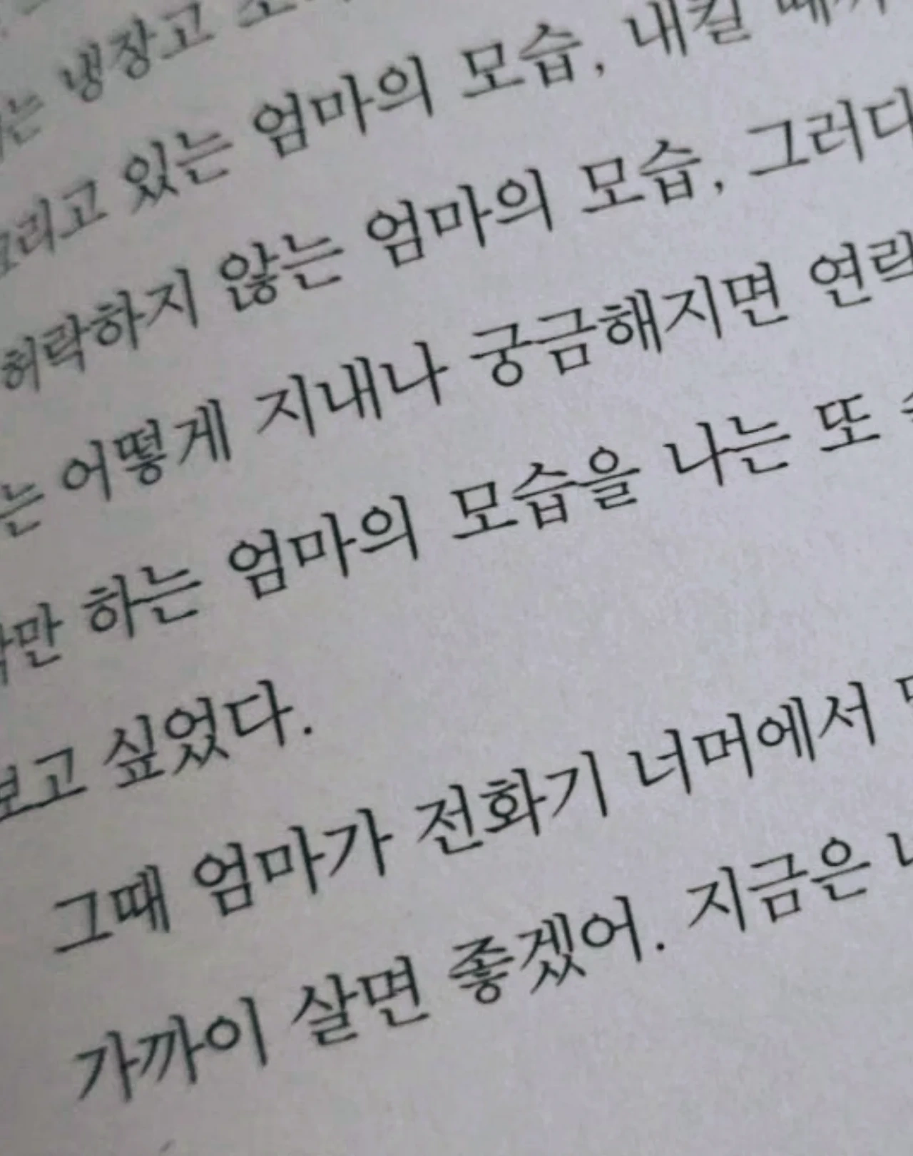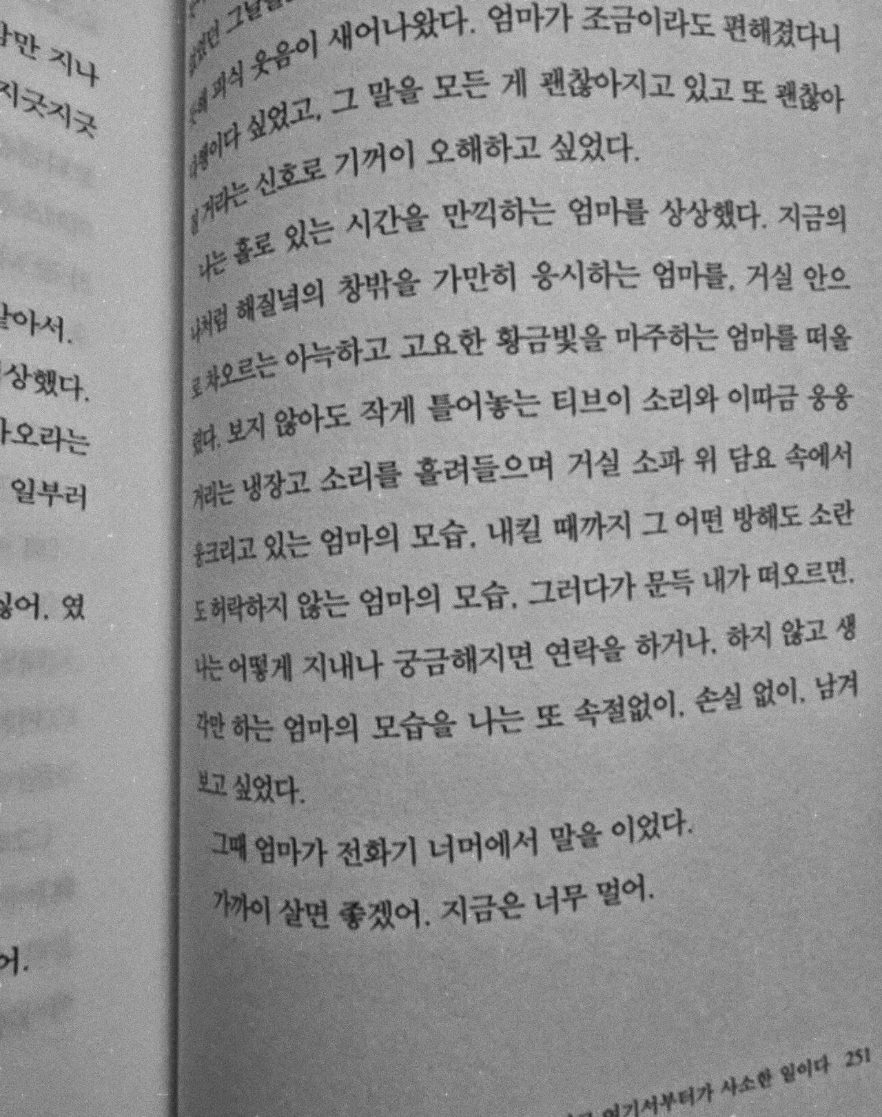 나는 홀로 있는 시간을 만끽하는 엄마를 상상했다. 지금의 나처럼 해질녁의 창밖을 가만히 응시하는 엄마를, 거실 안으로 차오르는 아늑하고 고요한 황금빛을 마주하는 엄마를 떠올렸다. 보지 않아도 작게 틀어놓는 티브이 소리와 이따금 웅웅거리는 냉장고 소리를 흘려들으며 거실 소파 위 담요 속에서 웅크리고 있는 엄마의 모습, 내킬 때까지 그 어떤 방해도 소란도 허락하지 않는 엄마의 모습, 그러다가 문득 내가 떠오르면, 나는 어떻게 지내나 궁금해지면 연락을 하거나, 하지 않고 생각만 하는 엄마의 모습을 나는 또 속절없이, 손실없이, 남겨 보고 싶었다. 그때 엄마가 전화기 너머에서 말을 이었다. 가까이 살면 좋겠어. 지금은 너무 멀어. p.251