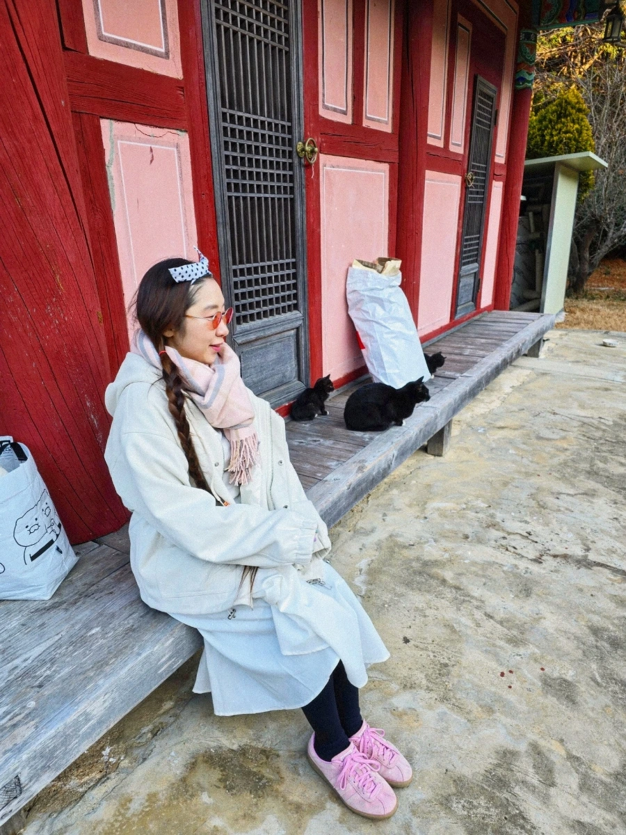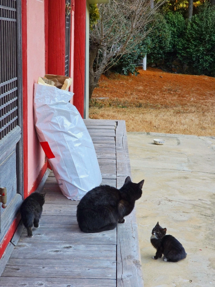 통영 미래사에 가면 고양이 가족들이 있다. 여름에 왔을 때는 하얀 얼룩 고양이들을 만났는데, 올 겨울에는 검은 고양이 네로들을 만났지. 통영의 신성한 사찰을 지키는 냥이들. 미래사를 둘러보다가 쉴겸 마루에 앉았는데 한 마리의 검은 새끼 고양이가 다가오는거야. 몇분이 지나고 어미인지 조금 큰 검은 고양이가 또 한마리의 새끼 고양이와 함께 다가와서 검은 고양이 네로 가족이 되었어.미래사경상남도 통영시 산양읍 미륵산길 192
