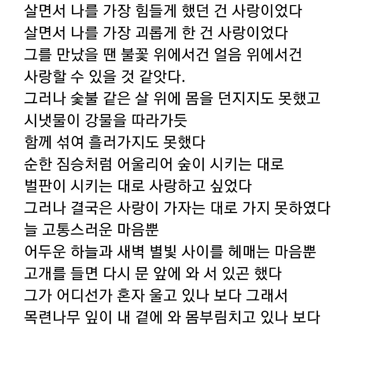 - 그가 나무에 기대앉아 울고 있나 보다 그래서 뜰의 목련나무들이 세차게 이파리를 흔들고 있나 보다 살면서 나를 가장 힘들게 한 건 사랑이었다 살면서 나를 가장 괴롭게 한건 사랑이었다 그를 만났을 땐 불꽃 위에서건 얼음 위에서건 사랑할 수 있을것 같았다 그러나 숯불 같은 살 위에 몸을 던지지도 못했고 시냇물이 강물을 따라 가듯 함께 섞여 흘러가지도 못했다 순한 짐승처럼 어울리어 숲이 시키는 대로 벌판이 시키는 대로 사랑하고 싶었다 그러나 결국은 사랑이 가자는 대로 가지 못했다 늘 고통스러운 마음뿐 어두운 하늘과 새벽 별빛 사이를 헤메는 마음뿐 고개를 들면 다시 문 앞에 와 서 있곤 했다 그가 어디선가 혼자 울고 있나 보다 그래서 목련나무 잎이 내곁에 와서 몸부림치고 있나 보다.