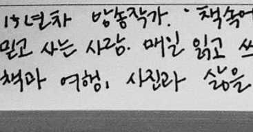 - 15년 차 방송작가. '책 속에 길이 있다' 라는 말을 믿고 사는 사람. 매일 읽고 쓰는 순간이 행복한 글쟁이. 책과 여행, 사진과 삶을 사랑합니다.