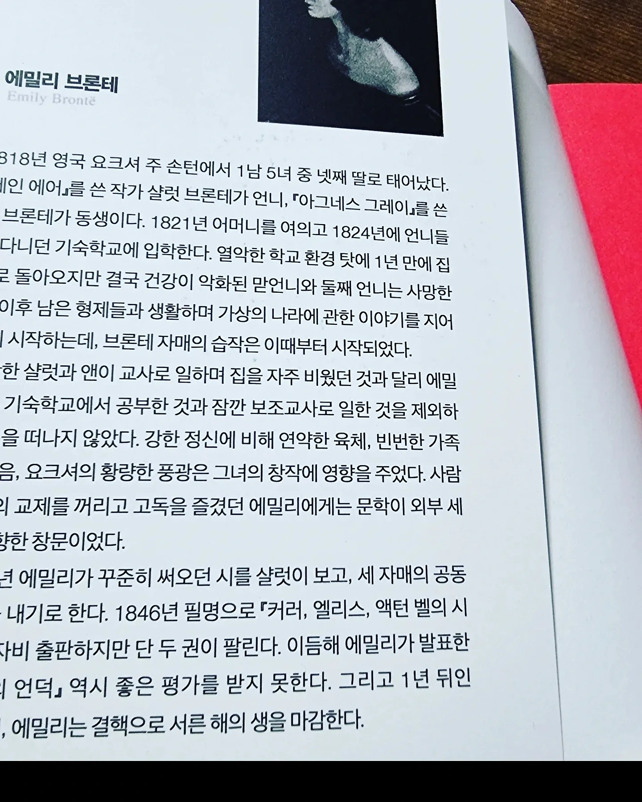 - 에밀리 브론테는 뼈속까지 작가다. [제인에어]를 쓴 작가 샬럿 브론테가 언니, [아그네스 그레이]를 쓴 앤 브론테가 동생이라고 한다. 그 시대에 여성이 글을 쓰고 습작한다는 것이 쉬운 일이 아닐텐데 그 어려운 것을 해낸 에밀리 브론테. 그러나 그녀의 삶은 불운하다. 서른 살에 결핵으로 생을 마감했다. 그럼에도 불구하고 그녀가 천재라는 건 500페이지가 넘는 이 책을, 마치 자신의 이야기인 처럼 써내려간 일기장같은 디테일한 문장력에 놀랐다. 그리고 호흡이 긴 이 스토리를 20대가 썼다는 사실도 놀랍다. 안타깝게도 이 글을 집필한 에밀리 브론테는 30살의 나이가 세상을 떠났다. 그녀의 작품속엔 또다른 그녀가 있다. 책 문장 하나하나의 독파하면서 아주 아름다웠을 그녀의 봄, 밤을 만난다.