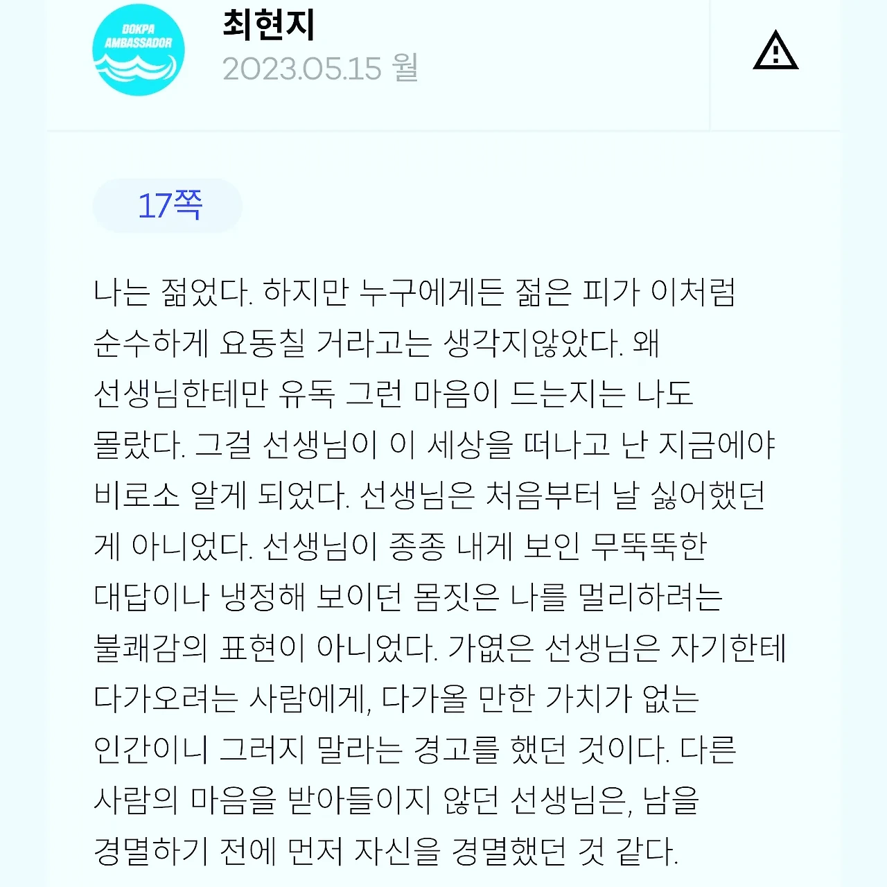 - 그는 원래 말이 없는 사람이었습니다. 평소에도 무슨 말을 하려고 하면 말하기 전에 입가에 실룩거리는 버릇이 있었습니다. 그의 입술이 그의 의지에 저항이라도 하듯 쉽게 열리지 않는 데에, 그가 하고 싶은 말의 심각성도 담겨 있었겠지요. 일단 말문이 터졌다 하면 그 목소리에는 보통 사람의 두 배나 되는 힘이 실려 있었습니다. 나는 그의 입술을 잠깐 보고, 또 무슨 말을 하겠구나 금방 알아차렸지만, 대체 뭘 준비하는지는 전혀 짐작하지 못했습니다. 그렇기 때문에 청천벽력이었습니다. 그의 잘 열리지 않는 입을 통해 따님에 대한 애절한 사랑 고백을 들었을 때의 나를 상상해보십시오. 나는 그의 마음지팡이로 단번에 화석으로 굳어버린 느낌이었습니다. - P 233