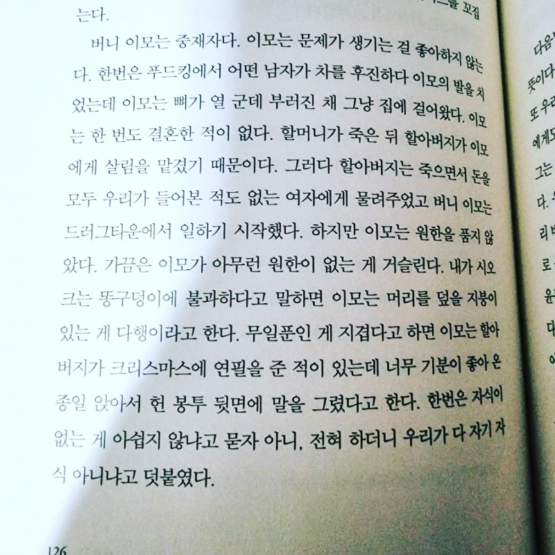 '천사도 없고 작은 바위 집도 없고 꽃도 없는' '이모는 평생 삶을 가져본 적이 없는' '결혼한 적도 없고 아이도 없고, 오로지 일 일 일 만.' - 136