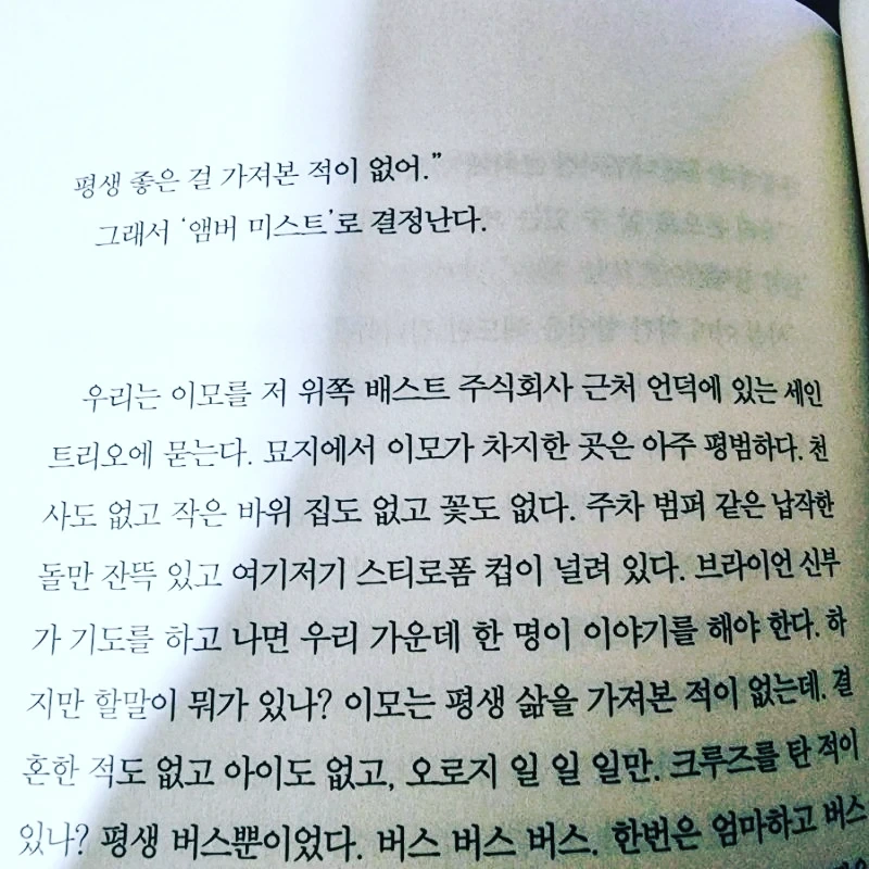 - “이모는 살면서 평생 좋은 걸 가져본 적이 없어.” 그래서 ‘앰버 미스트’로 결정 난다. 묘지에서 이모가 차지한 곳은 아주 평범하다. 천사도 없고 작은 바위 집도 없고 꽃도 없다. 주차 범퍼 같은 납작한 돌만 잔뜩 있고 여기저기 스티로폼 컵이 널려 있다. 브라이언 신부가 기도를 하고 나면 우리 가운데 한 명이 이야기를 해야 한다. 하지만 할 말이 뭐가 있나? 이모는 평생 삶을 가져본 적이 없는데. 결혼한 적도 없고 아이도 없고, 오로지 일 일 일만. 크루즈를 탄 적이 있나? 평생 버스뿐이었다. 버스 버스 버스. - P 135~136