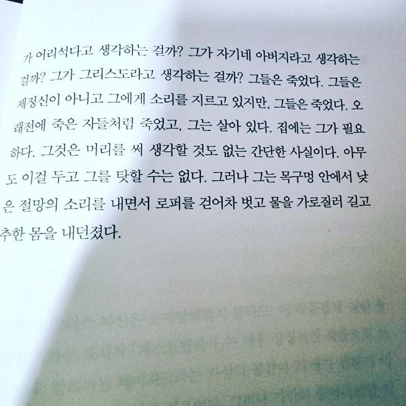 - 여자애들이 이제 그를 보았고 그들은 손으로 자기들이 곧 죽을 거라고 설명하고 있는 것 같았다. 맙소사, 저 애들은 그가 눈이 멀었다고 생각하는 걸까? 그가 자기네 아버지라고 생각하는 걸까? 그가 그리스도라고 생각하는 걸까? 그들은 죽었다. 그들은 제정신이 아니고 그에게 소리를 지르고 있지만, 그들은 죽었다. 오래전에 죽은 자들처럼 죽었고, 그는 살아 있다. 집에는 그가 필요하다. 그것은 머리를 써 생각할 것도 없는 간단한 사실이다. 아무것도 이걸 두고 그를 탓할 수는 없다. 그러나 그는 목구멍 안에서 낮은 절망의 소리를 내면서 로퍼를 걷어차 벗고 물을 가로질러 길고 추한 몸을 내던졌다. - P 242~243
