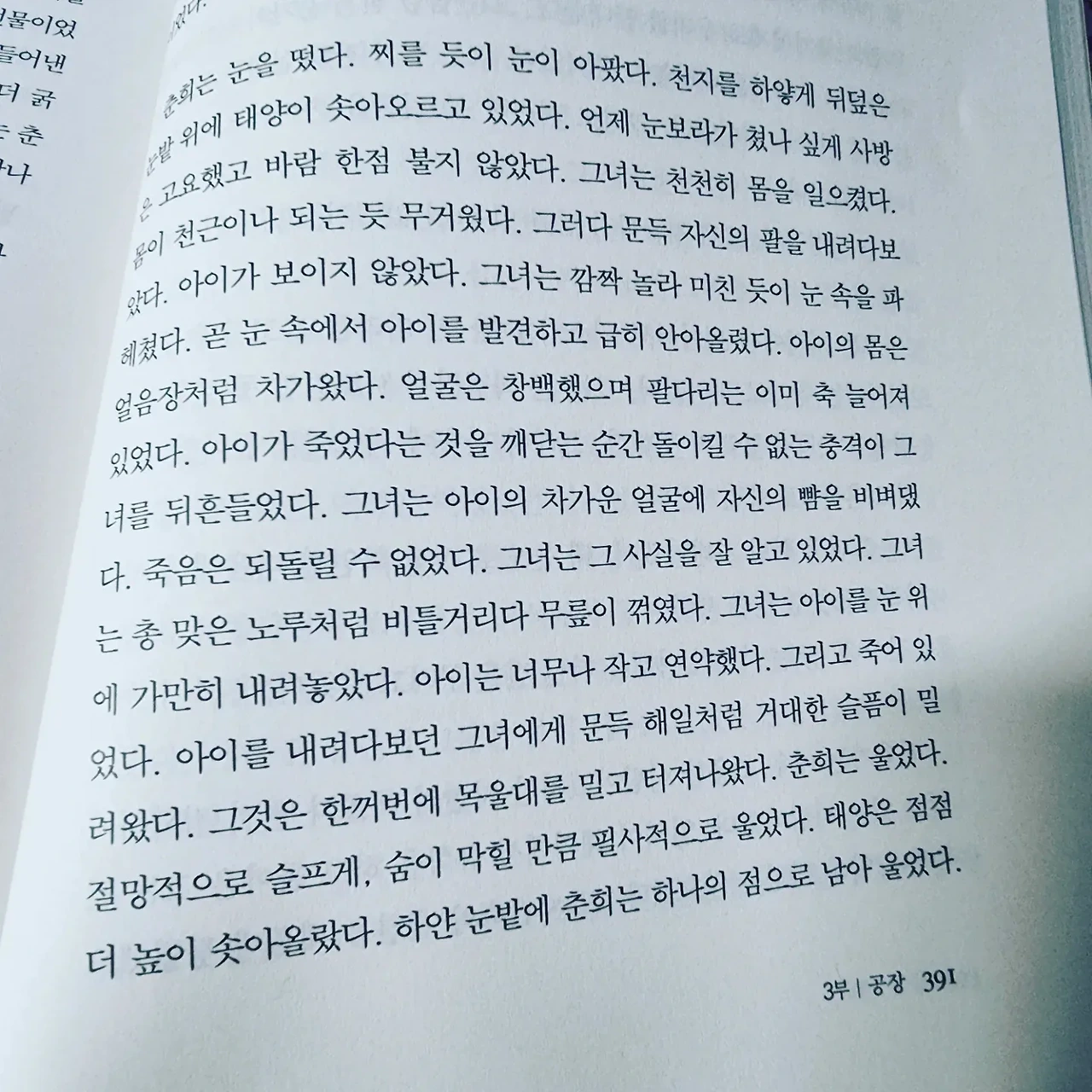 - 아이가 죽었다는 것을 깨닫는 순간 돌이킬 수 없는 충격이 그녀를 뒤흔들었다. 그녀는 아이의 차가운 얼굴에 자신의 빰을 비벼댔다. 죽음은 되돌릴 수 없었다. 그녀는 그 사실을 알고 있었다. 그녀는 총 맞은 노루처럼 비틀거리다 무릎이 꺾였다. 그녀는 아이를 눈 위에 가만히 내려놓았다. 아이는 너무나 작고 연약했다. 그리고 죽어 있었다. 아이를 내려다보던 그녀에게 문득 해일처럼 거대한 슬픔이 밀려왔다. 그것은 한꺼번에 목울대를 밀고 터져나왔다. 춘희는 울었다. 절망적으로 슬프게, 숨이 막힐 만큼 필사적으로 울었다. - p 391