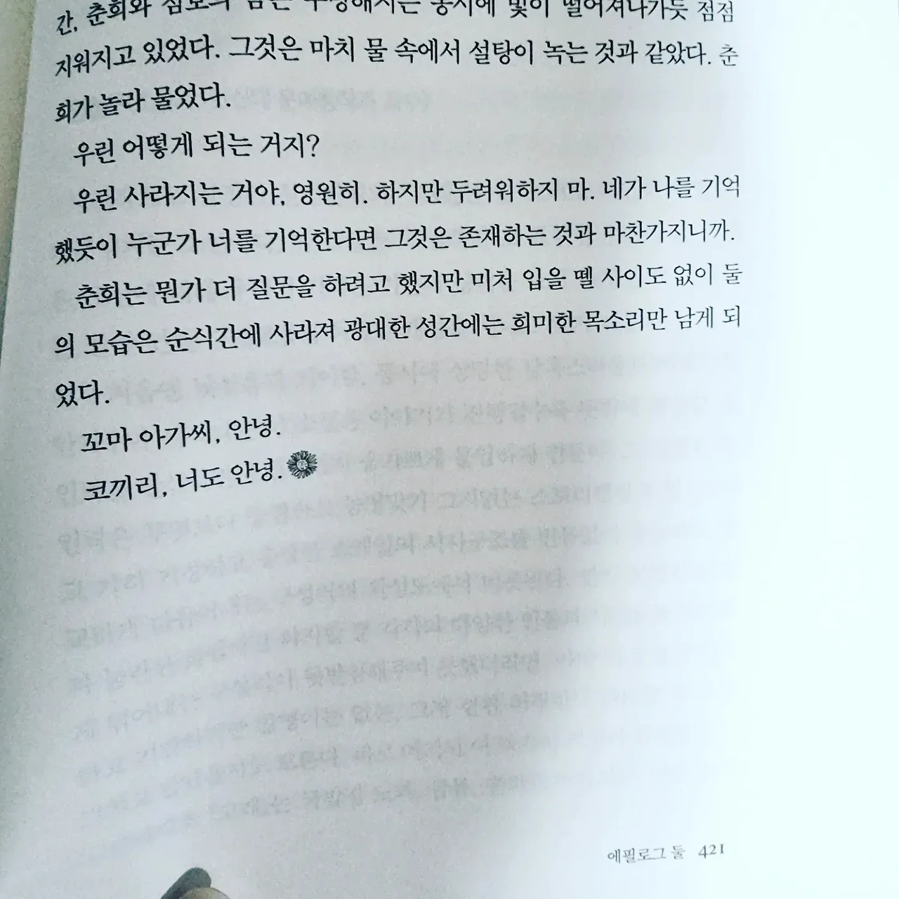 - 우린 어떻게 되는 거지? 우린 사라지는 거야, 영원히. 하지만 두려워하지 마. 네가 나를 기억했듯이 누군가 너를 기억한다면 그것은 존재하는 것과 마찬가지니까. 춘희는 뭔가 더 질문을 하려고 했지만 미처 입을 뗄 사이도 없이 둘의 모습은 순식간에 사라져 광대한 성간에는 희미한 목소리만 남게 되었다. 꼬마 아가씨, 안녕. 코끼리, 너도 안녕. - p 421