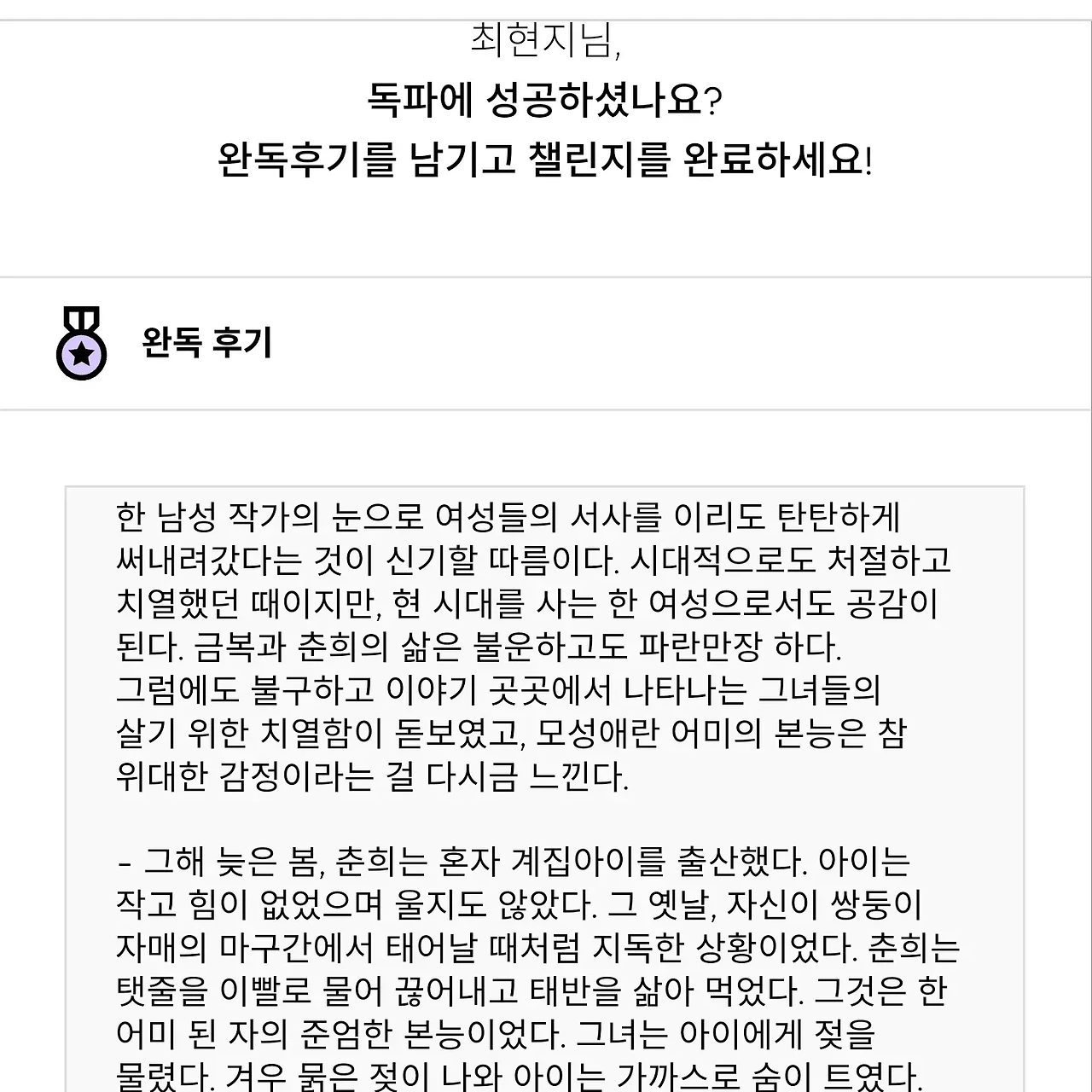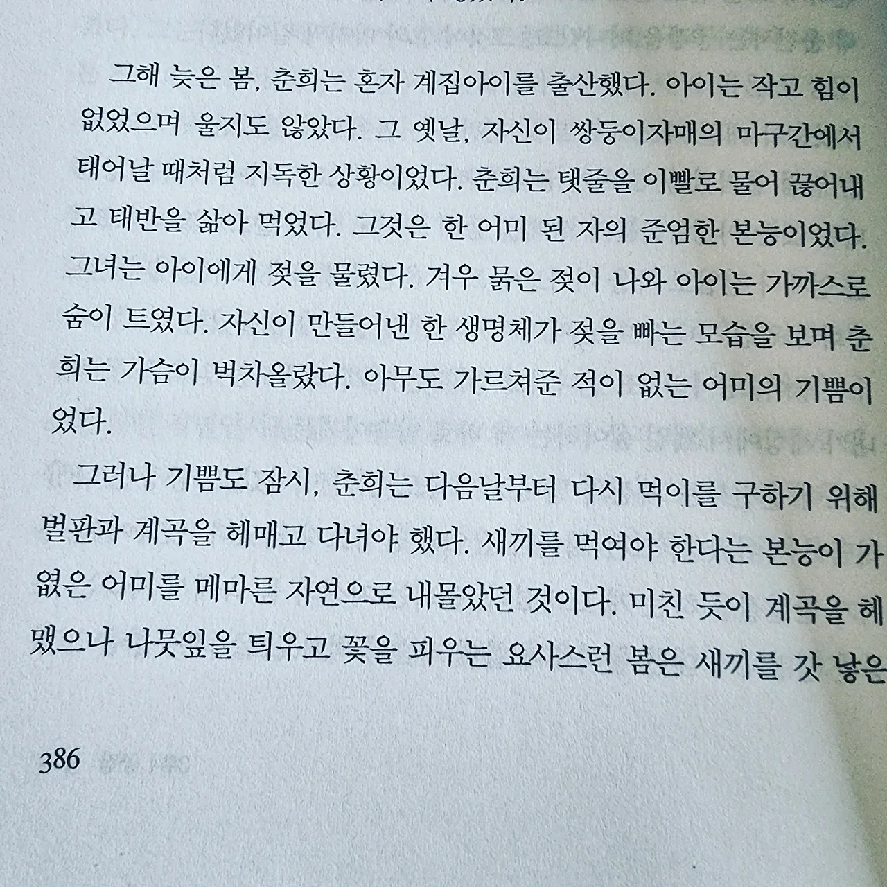 - 그해 늦은 봄, 춘희는 혼자 계집아이를 출산했다. 아이는 작고 힘이 없었으며 울지도 않았다. 그 옛날, 자신이 쌍둥이자매의 마구간에서 태어날 때처럼 지독한 상황이었다. 춘희는 탯줄을 이빨로 물어 끊어내고 태반을 삶아 먹었다. 그것은 한 어미 된 자의 준엄한 본능이었다. 그녀는 아이에게 젖을 물렸다. 겨우 묽은 젖이 나와 아이는 가까스로 숨이 트였다. 자신이 만들어낸 한 생명체가 젖을 빠는 모습을 보며 춘희는 가슴이 벅차올랐다. 아무도 가르쳐준 적이 없는 어미의 기쁨이었다. - p 386