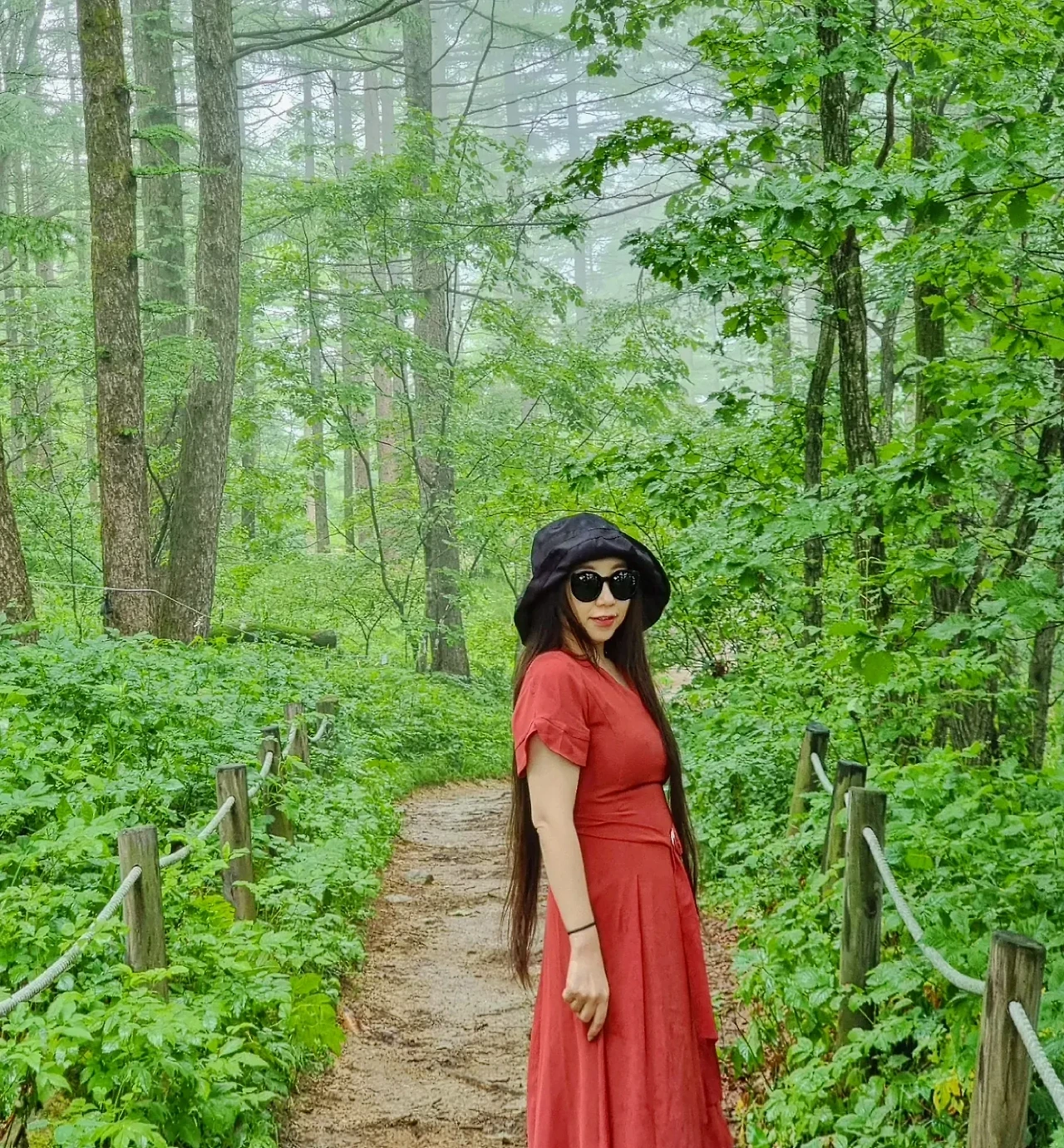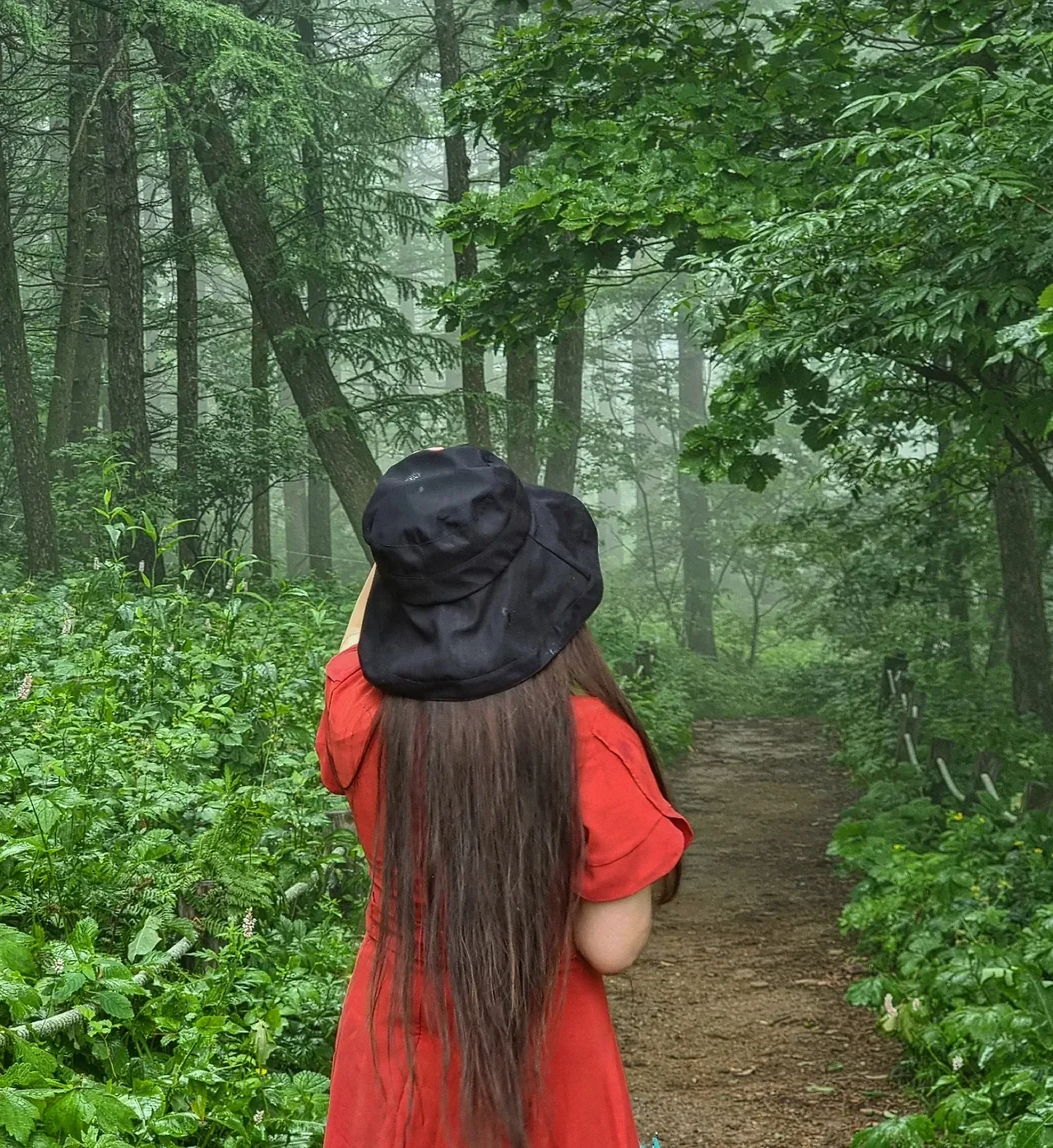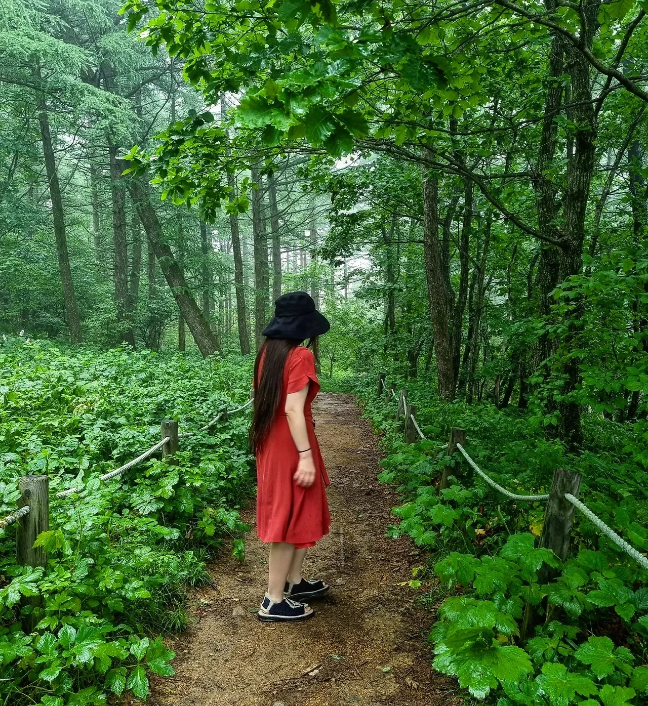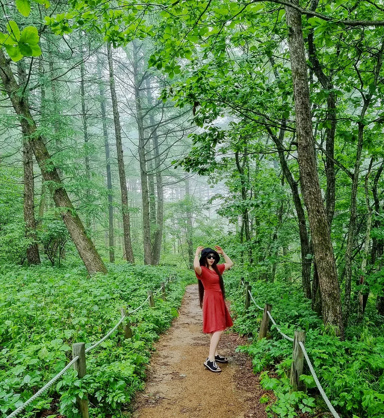 비오는 날의 빨강 원피스를 입는다. 비가 오면 올수록 곳곳의 온도를 뜨겁게 한다. 해발 1330m의 높은 고산지에서 싹을 틔우고 자라나는 야생화들은 얼마나 건강할까. 쓰고 있던 우산을 접고 울창한 소나무 숲길을 걸었다. 위대한 자연 속으로 걷는다. 그 순간, 탱고를 추면서 숲속을 지나면 스페인의 어느 고요한 마을이 나타나지 않을까 하고 재미난 상상도 했던 그녀의 여름, 비오는 날의 #만항재 .
