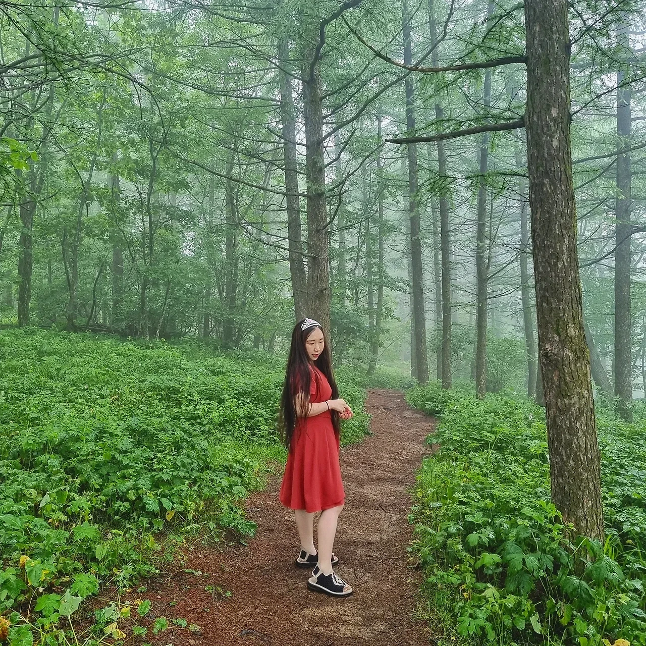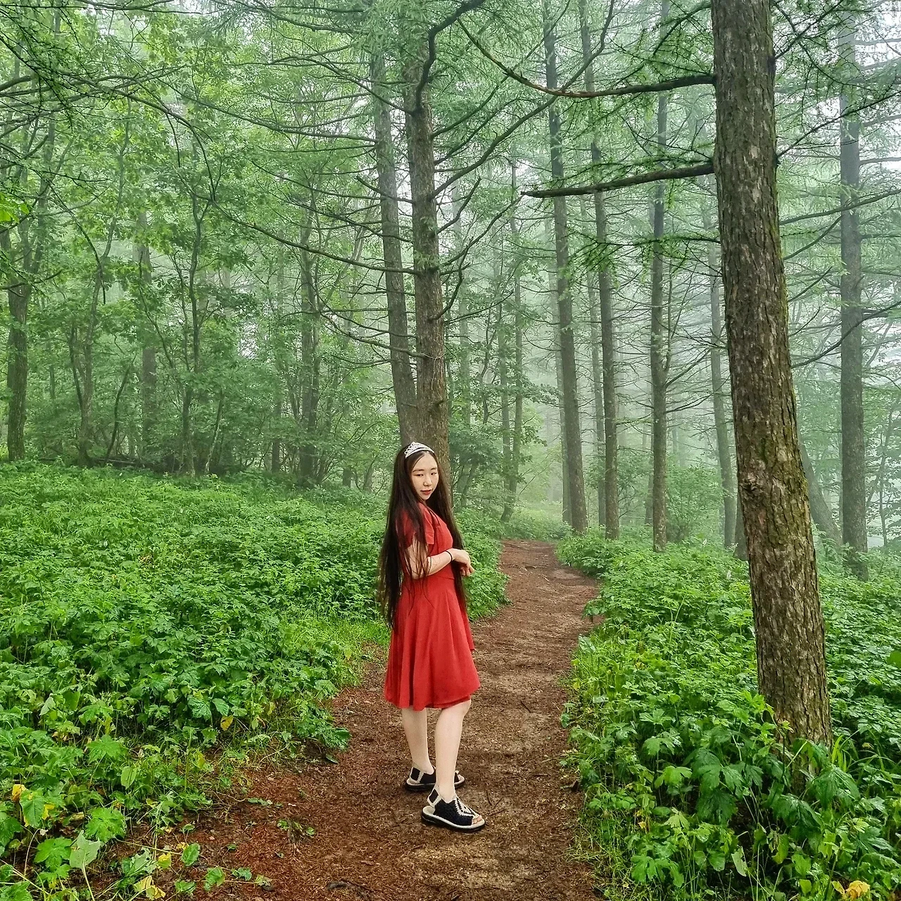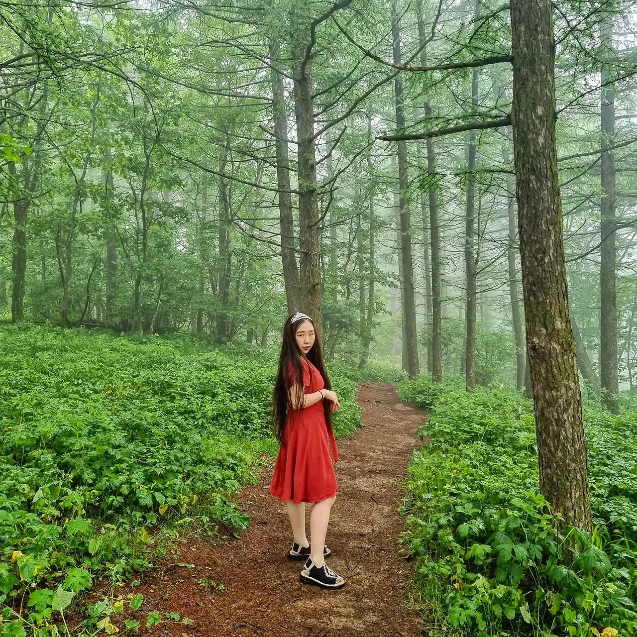 - 자욱한 안개 속에서도 푸름과 붉음은 선명하다. 끝없이 펼쳐진 소나무 숲길을 걸으며 풀냄새를 맡고 풀바람이 살랑 불어와 치마의 옷끝을 살랑이게 한다. 이름 모를 야생화들이 활짝 피어 있다. 그 때, 우산을 접고 비를 맞는다. 왠지 이 비를 맞으면 야생화처럼 생기롭게 피어날 것만 같은 느낌.