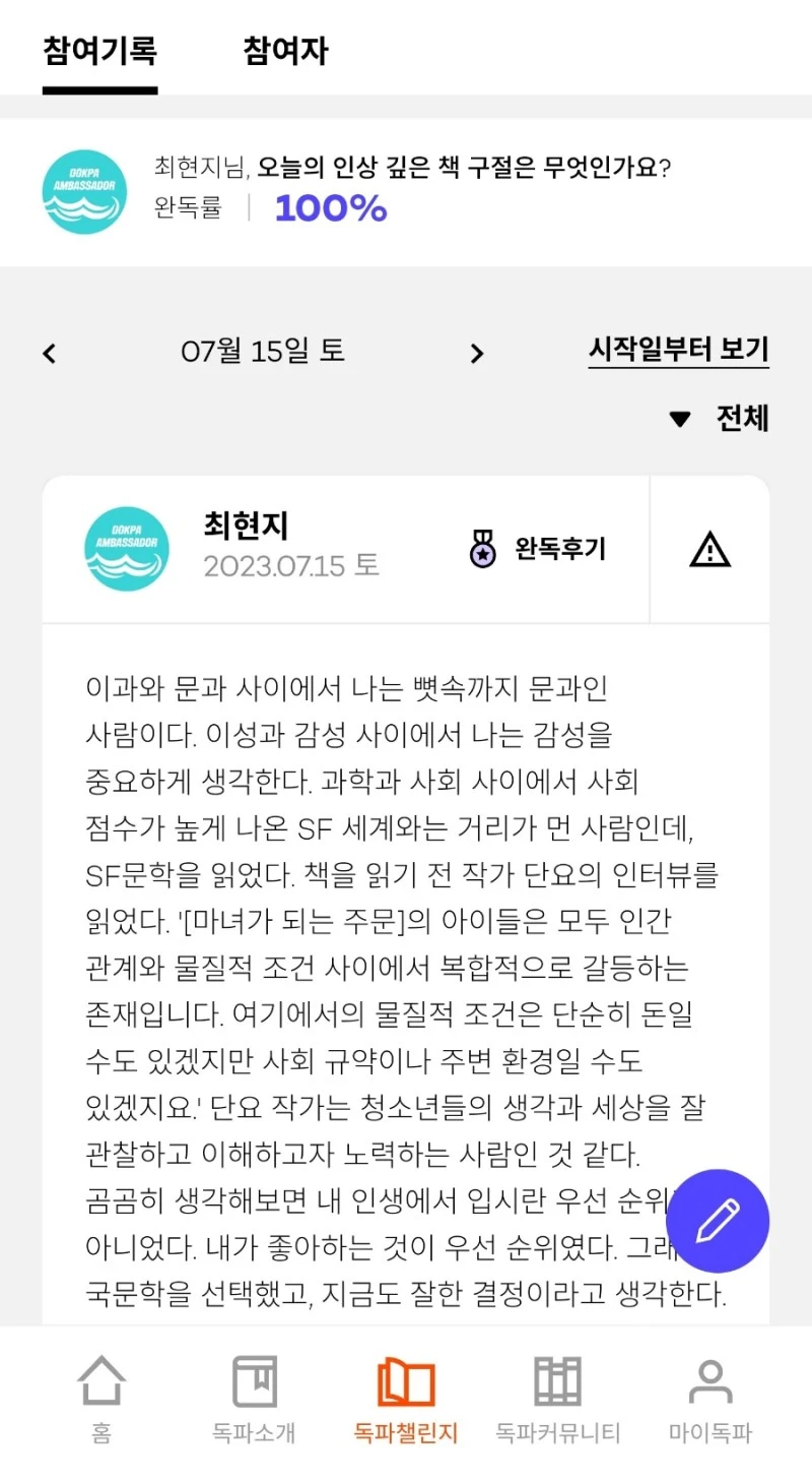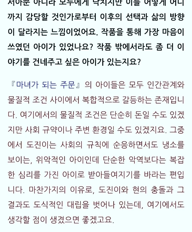 - 서아라는 인물은 어쩌면 대다수의 그 또래를 대변하는 보통의 인물이다. 누군가가 공부를 하고 무언가를 할 때, 서아는 죽음을 연습했다. 그 시기 현을 만나 새로운 세계로 입문하게 되는데, 어쩌면 서아가 그 세계를 만나지 않았다면, 죽음을 선택했을 것 같다. 소설 속 아이들이 현실을 탈출 할 수 있는 방법은 선택받고 날아오르거나, 그러지 못해 떨어지거나. 선택의 폭이 이리도 단순하고 좁다는 게 아쉽다. [마녀가 되는 주문]에는 어른이 없다. 그저 아이들 서로가 서로에게 어른이 되어줄 뿐, 사랑이 없다. 어쩌면 한 사람이라도 찐 어른이 있었다면 소설 속 이러한 세계 자체가 만들어지질 않았겠지. 현실 사회는 곳곳의 많은 어른들이 있고, 아이들을 지켜낼 수 있는 힘도 있다. 어제보다 더 나은 오늘이 있고, 오늘보다 더 성장하는 내일의 아이들을 위해 멋진 어른이 되어야 겠다는 생각이 든다.