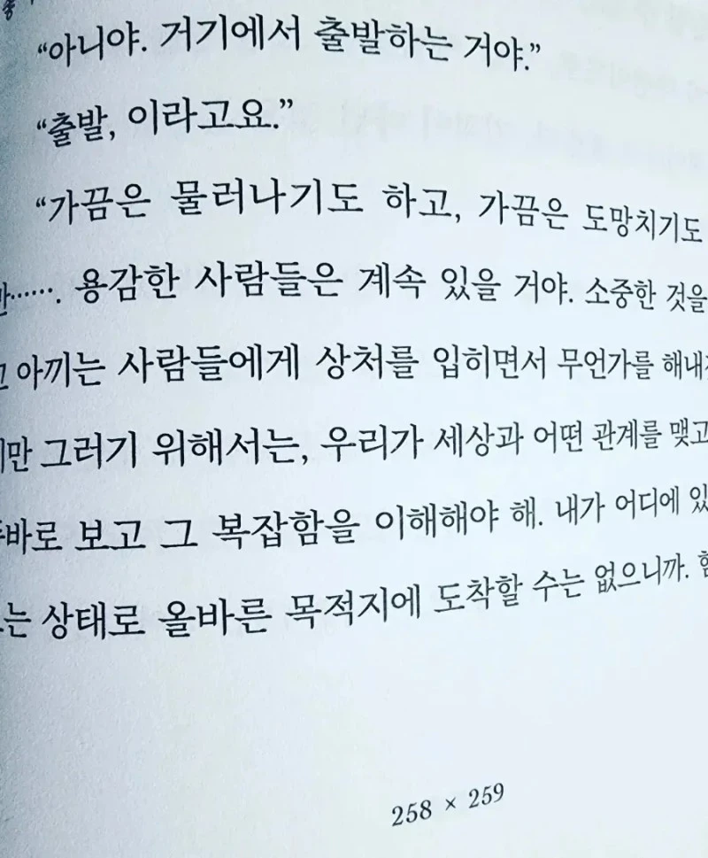 - “아니야, 거기에서 출발하는 거야.” “출발, 이라고요.” “가끔은 물러나기도 하고, 가끔은 도망치기도 하겠지만. 용감한 사람들은 계속 있을 거야. 소중한 것을 포기하고 아끼는 사람들에게 상처를 입히면서 무언가를 해내겠지. 하지만 그러기 위해서는, 우리가 세상과 어떤 관계를 맺고 있는지 똑바로 보고 그 복잡함을 이해해야 해. 내가 어디에 있는지 모르는 상태로 올바른 목적지에 도착할 수는 없으니까. P.259