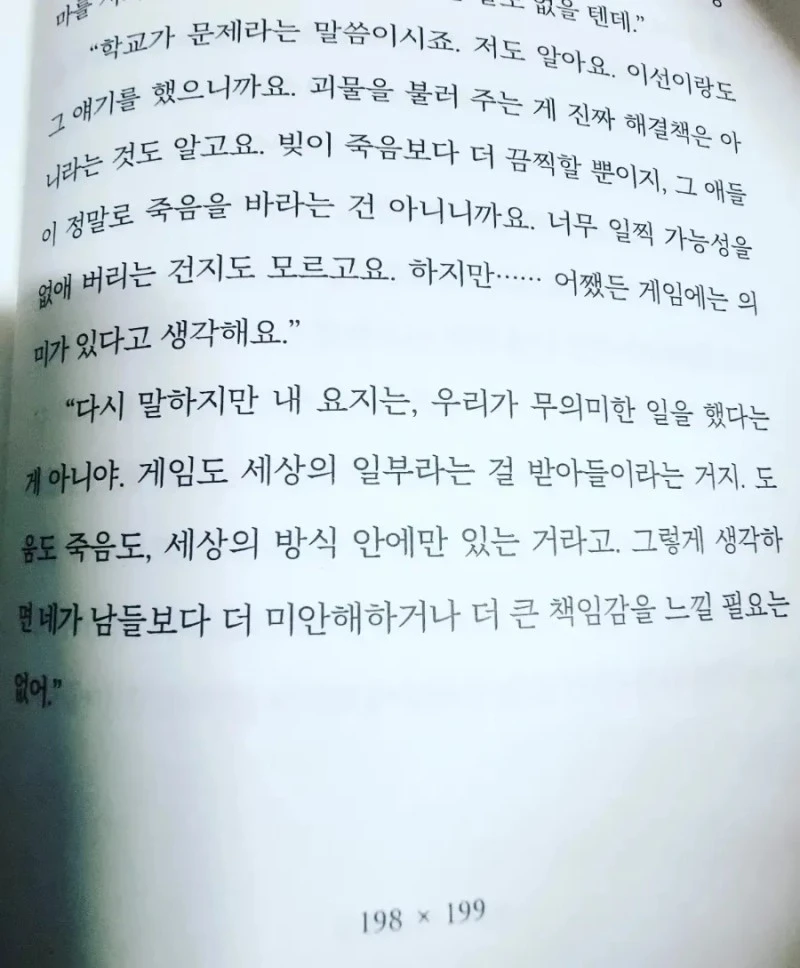 - ”학교가 문제라는 말씀이시죠. 저도 알아요. 이선이랑도 그 얘기를 했으니까요. 괴물을 불러 주는 게 진짜 해결책은 아니라는 것도 알고요. 빚이 죽음보다 더 끔찍할 뿐이지, 그 애들이 정말로 죽음을 바라는 건 아니니까요. 너무 일찍 가능성을 없애 버리는 건지도 모르고요. 하지만 어쨌든 게임에는 의미가 있다고 생각해요.“ ”다시 말하지만 내 요지는, 우리가 무의미한 일을 했다는 게 아니야. 게임도 세상의 일부라는 걸 받아들이라는 거지. 도움도 죽음도, 세상의 방식 안에만 있는 거라고. 그렇게 생각하면 네가 남들보다 더 미안해하거나 더 큰 책임감을 느낄 필요는 없어.“ - P. 199