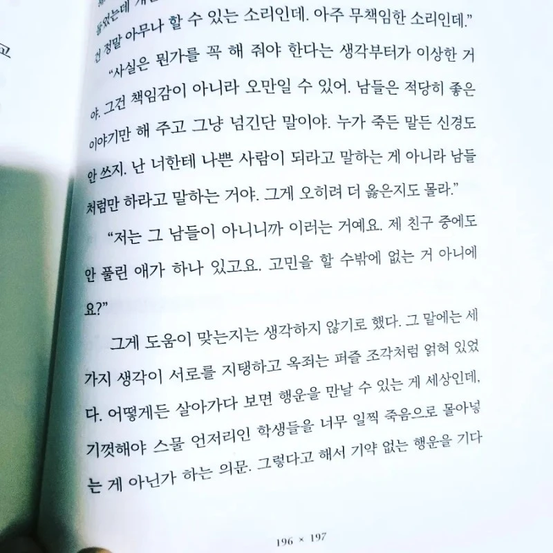 - “사실은 뭔가를 꼭 해 줘야 한다는 생각부터가 이상한 거야. 그건 책임감이 아니라 오만일 수 있어. 남들은 적당히 좋은 이야기만 해 주고 그냥 넘긴단 말이야. 누가 죽든 말든 신경도 안 쓰지. 난 너한테 나쁜 사람이 되라고 말하는 게 아니라 남들처럼만 하라고 말하는 거야. 그게 오히려 더 옳은지도 몰라.” “저는 그 남들이 아니니까 이러는 거예요. 제 친구 중에도 안 풀린 애가 하나 있고요. 고민을 할 수 밖에 없는 거 아니에요?” 그게 도움이 맞는지는 생각하지 않기도 했다. 그 말은 세 가지 생각이 서로를 지탱하고 옥죄는 퍼즐 조각처럼 얽혀 있었다. 어떻게든 살아가다 보면 행운을 만날 수 있는 게 세상인데, 기껏해야 스물 언저리인 학생들을 너무 일찍 죽음으로 몰아넣는 게 아닌가 하는 의문. - P.197