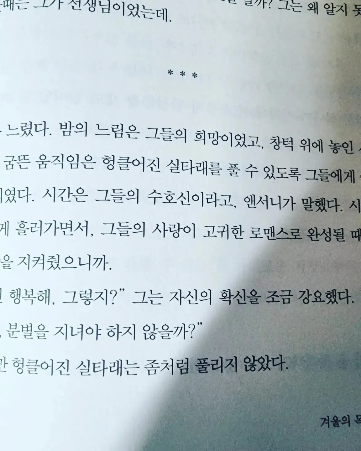 - 밤은 느렸다. 밤의 느림은 그들의 희망이었고, 창턱 위에 놓인 시곗바늘의 굼뜬 움직임은 헝클어진 실타래를 풀 수 있도록 그들에게 주어진 기회였다. 시간은 그들의 수호신이라고, 앤서니가 말했다. 시간은 공호하게 흘러가면서, 그들의 사랑이 고귀한 로맨스로 완성될 때까지 그 사랑을 지켜줬으니까. “우린 행복해, 그렇지?” 그는 자신의 확신을 조금 강요했다. “그러니 우리, 분별을 지녀야 하지 않을까?” 하지만 헝클어진 실타래는 좀처럼 풀리지 않았다. - <마지막 이야기들> 단편 소설 중 [겨울의 목가] p.203