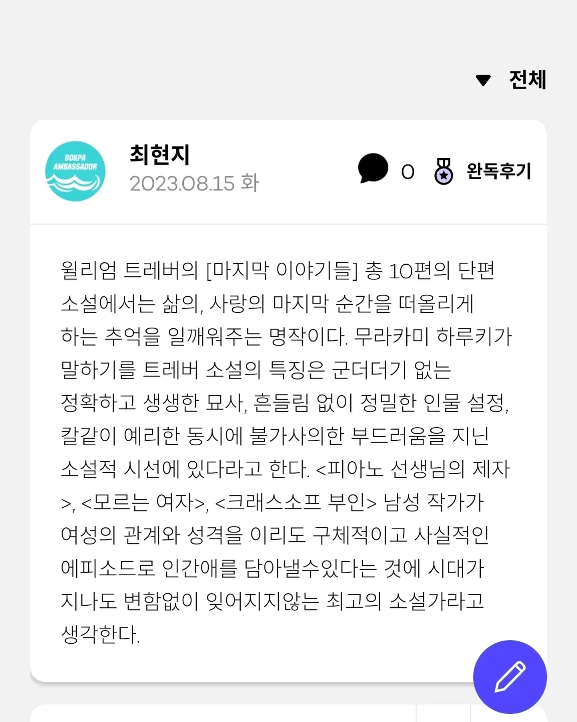 [마지막 이야기들] 제목에 이끌여 선택했다. 8월이 독파 2기로 활동이 끝나는 달이기도 하고, 뭔가 늦여름 초가을이 시작되는 기점에서 마지막 여름을 아름답게 마무리하고 싶어서 선택했다. 단편 소설 [모르는 여자]에서 에밀리의 마지막 선택은 사고 자살이 아니었을까. 가질 수 없는 사랑을 가지려 하지 않고 욕심 내려 하지 않는 에밀리는 결국 삶을 스스로 끝냈을 것이다. 사랑하고 싶고, 사랑받고 싶지만, 사랑을 받아본 기억이 없기에 사랑을 할수도 없는 에밀리의 외로운 삶이 왠지 씁쓸하다. 삶의 마지막 선택이 죽음이라니 마음이 아프다. 윌리엄 트레버의 [마지막 이야기들] 총 10편의 단편 소설에서는 삶의, 사랑의 마지막 순간을 떠올리게 하는 추억을 일깨워주는 명작이다. 무라카미 하루키가 말하기를 트레버 소설의 특징은 군더더기 없는 정확하고 생생한 묘사, 흔들림 없이 정밀한 인물 설정, 칼같이 예리한 동시에 불가사의한 부드러움을 지닌 소설적 시선에 있다라고 한다. <피아노 선생님의 제자>, <모르는 여자>, <크래스소프 부인> 남성 작가가 여성의 관계와 성격을 이리도 구체적이고 사실적인 에피소드로 인간애를 담아낼수있다는 것에 시대가 지나도 변함없이 잊어지지않는 최고의 소설가라고 생각한다.