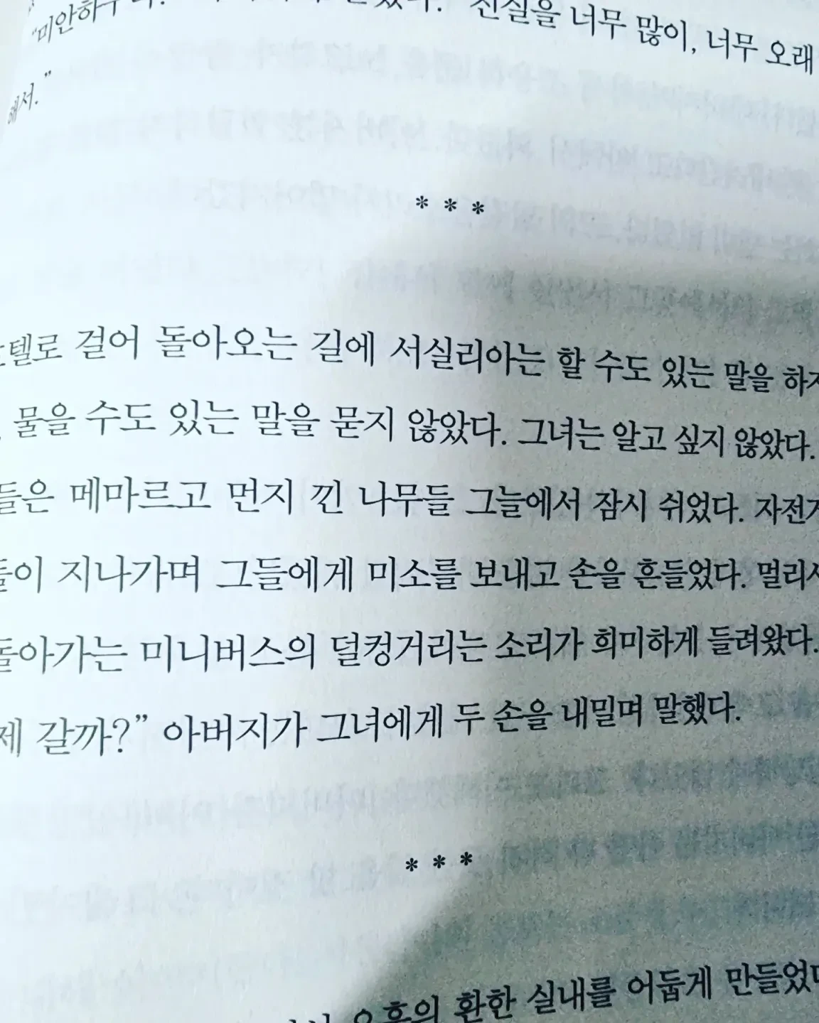 - 호텔로 걸어 돌아가는 길에 서실리아는 할 수도 있는 말을 하지 않았고, 물을 수도 있는 말을 묻지 않았다. 그녀는 알고 싶지 않았다. 그들은 메마르고 먼지 낀 나무들 그늘에서 잠시 쉬었다. 자전거 탄 사람들이 지나가며 그들에게 미소를 보내고 손을 흔들었다. 멀리서 항구로 돌아오는 미니버스와 덜컹거리는 소리가 희미하게 들려왔다. “이제 갈까?” 아버지가 그녀에게 두 손을 내밀며 말했다. - <마지막 이야기들> 단편 소설 중 [여자들] p.237