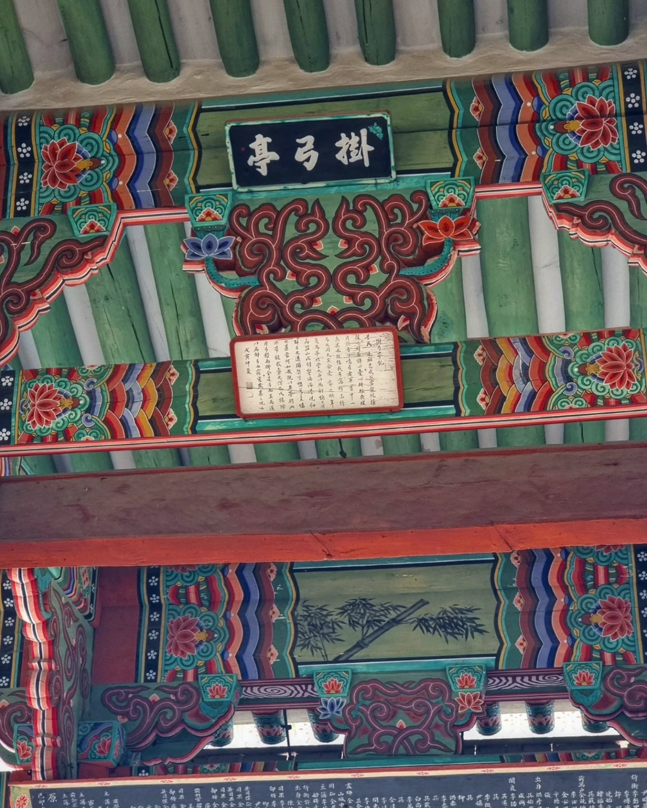 4면이 모두 개방되고 내부도 막힌 벽이 없이 기둥만 정연하게 배열되었다. 전후면에서 안쪽으로 제2주열(柱列)에 각각 고주(高柱)를 한 줄로 세워 그 위에 대량(大樑)을 걸쳤으며 이 고주와 변주(邊柱)는 퇴량(退樑)으로 서로 연결하였다. 건물 측면의 가운데 있는 기둥에서부터 대량에 걸쳐 충량(衝樑)이 배치되었다.