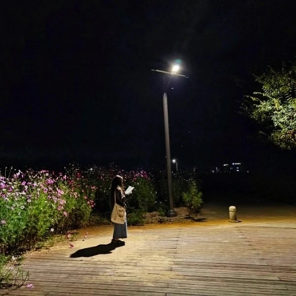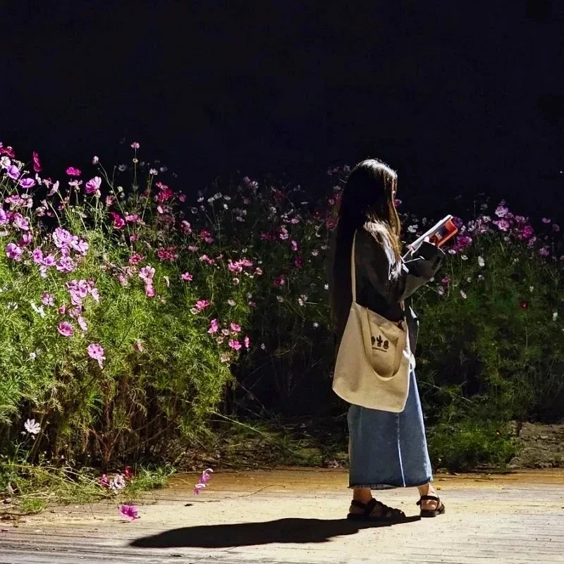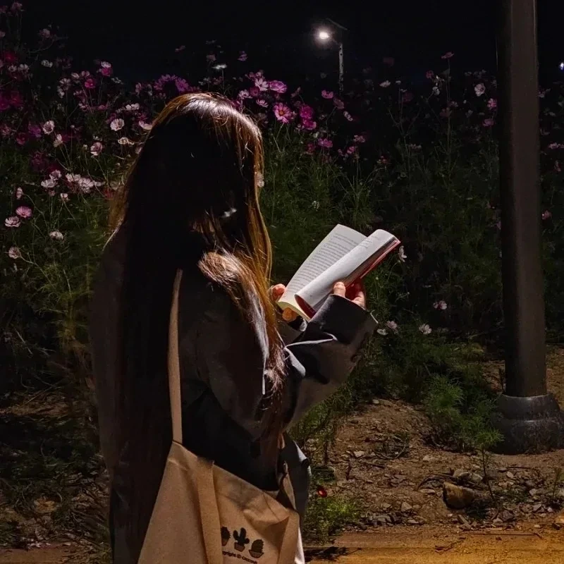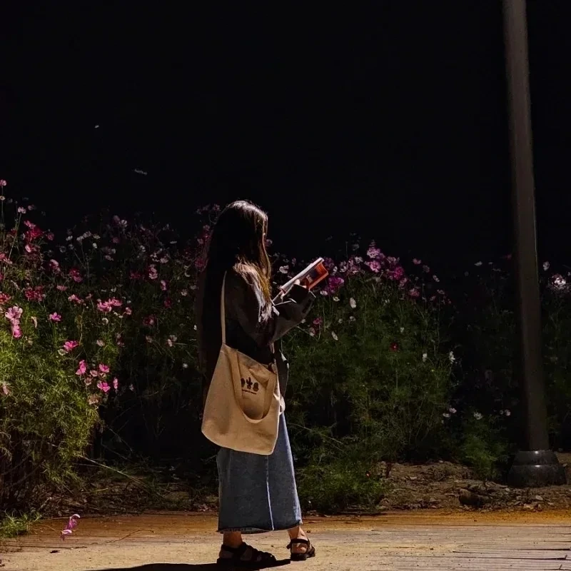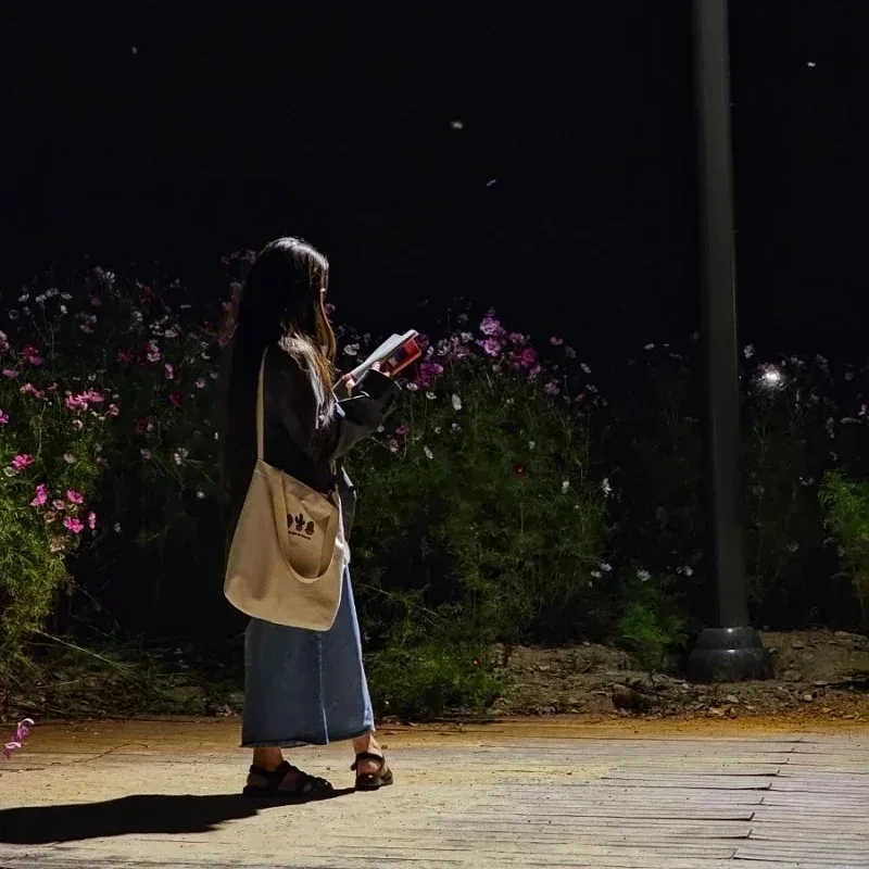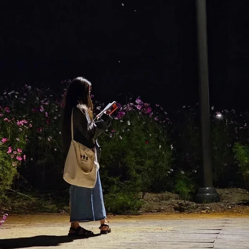 가을 밤, 코스모스 꽃밭에는 어둠이 자욱하다. 밤 하늘엔 반짝반짝 별이 빛나고 내 마음에도 가을꽃이 피어오른다. 가로등 빛을 벗삼아 책을 보다가 달빛을 따라서 길을 걷는 밤.