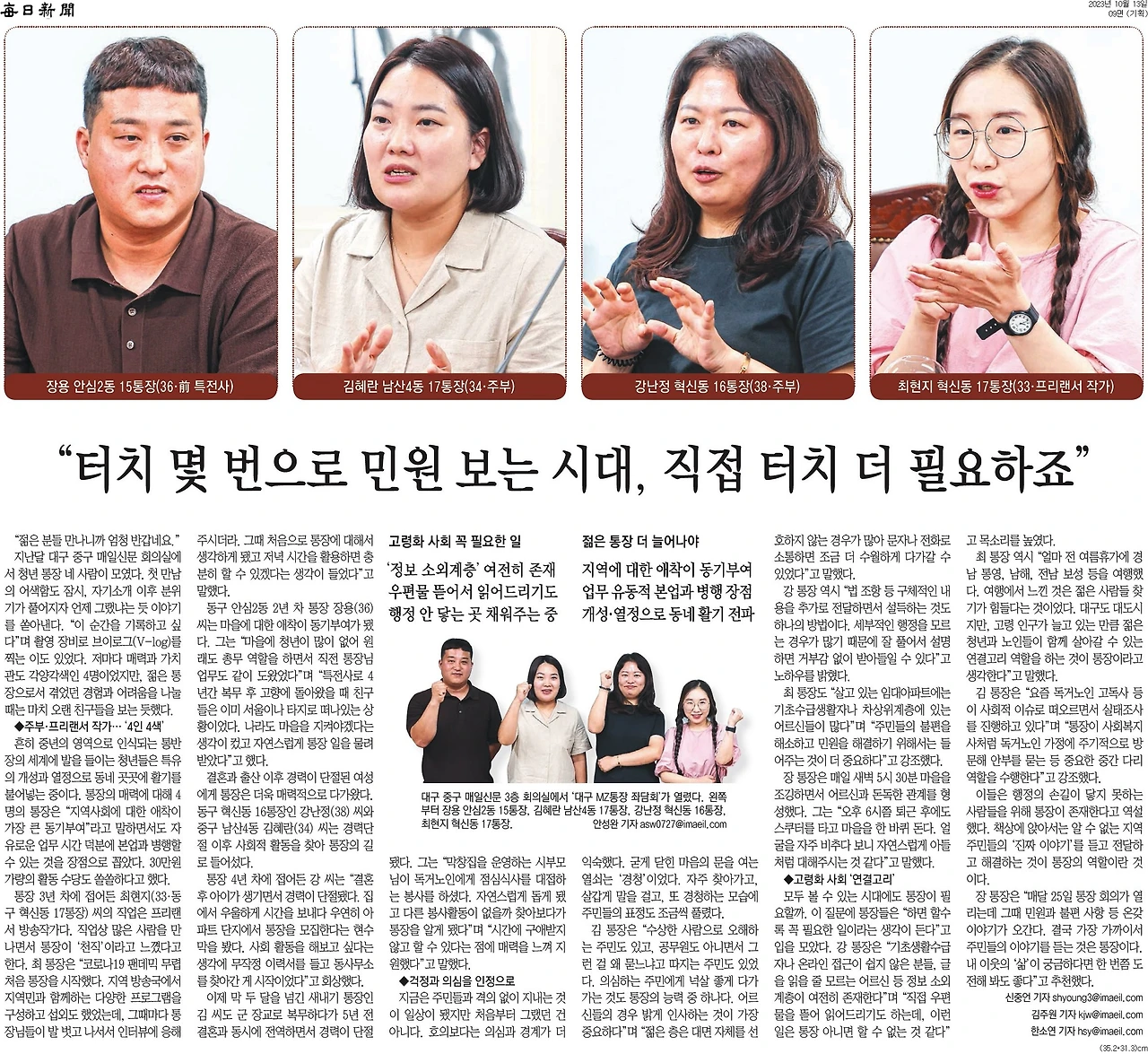 지난달 대구 중구 매일신문 회의실에서 청년 통장 네 사람이 모였다. 첫 만남의 어색함도 잠시, 자기소개 이후 분위기가 풀어지자 언제 그랬냐는 듯 이야기를 쏟아낸다. "이 순간을 기록하고 싶다"며 촬영 장비로 브이로그(V-log)를 찍는 이도 있었다. 저마다 매력과 가치관도 각양각색인 4명이었지만, 젊은 통장으로서 겪었던 경험과 어려움을 나눌 때는 마치 오랜 친구들을 보는 듯했다.