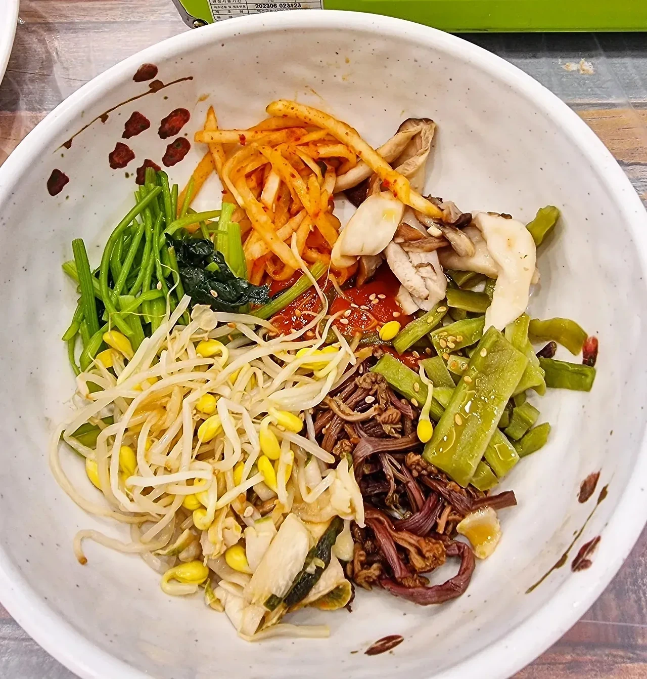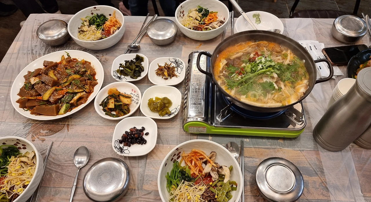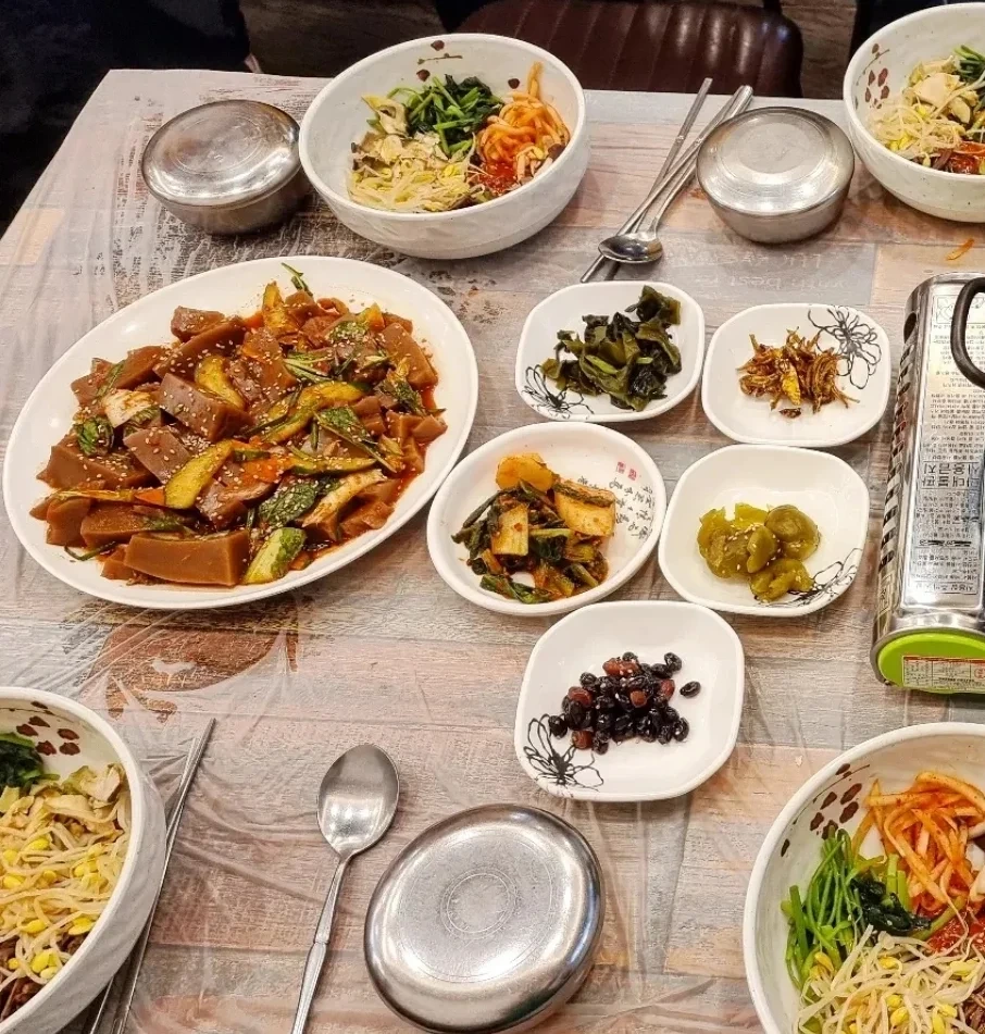- 한국인의 밥상은 늘 푸짐하다. 특히 점심은 더욱 그러하다. 가을엔 역시 산채비빔밥이다. 콩나물, 고사리, 버섯, 미나리, 무채 등 가지각색 나물에다가 붉고 매운 고추장 한 스푼, 그리고 고슬고슬한 밥 한공기면 뚝딱. 이것이 밥심이지. 거기다 담백한 두부전골전골로 속을 뜨끈하게 대운다. 그럼에도 불구하고 가장 맛있는 별미는 가을 도토리묵. 이래서 가을은 #천고마비의계절