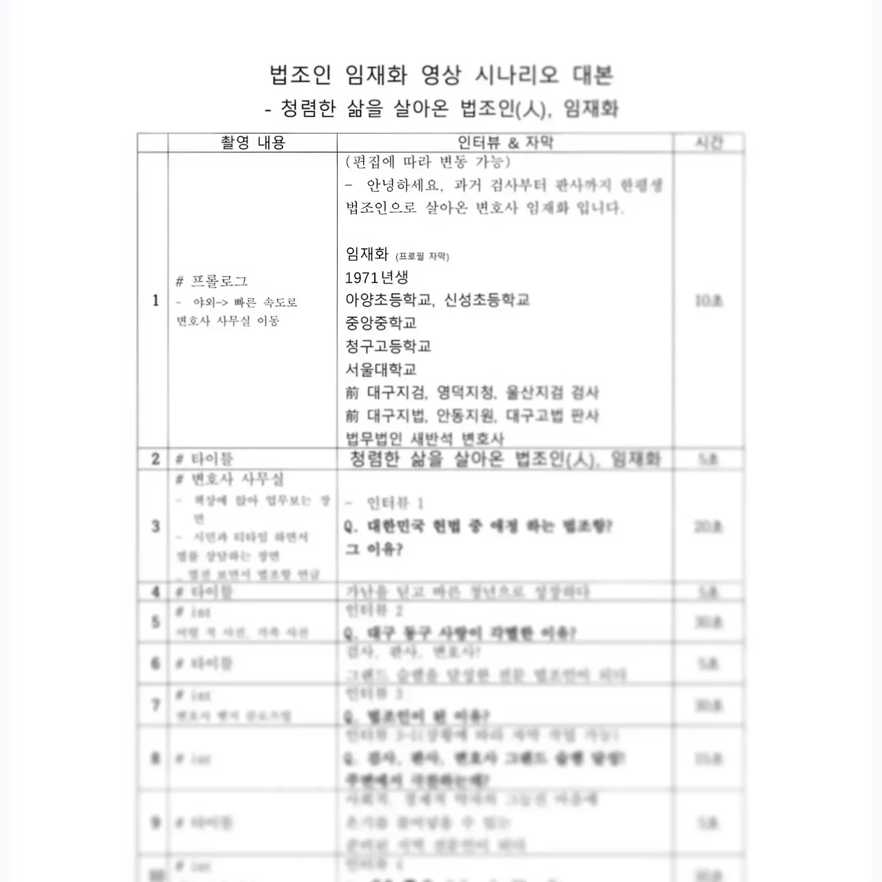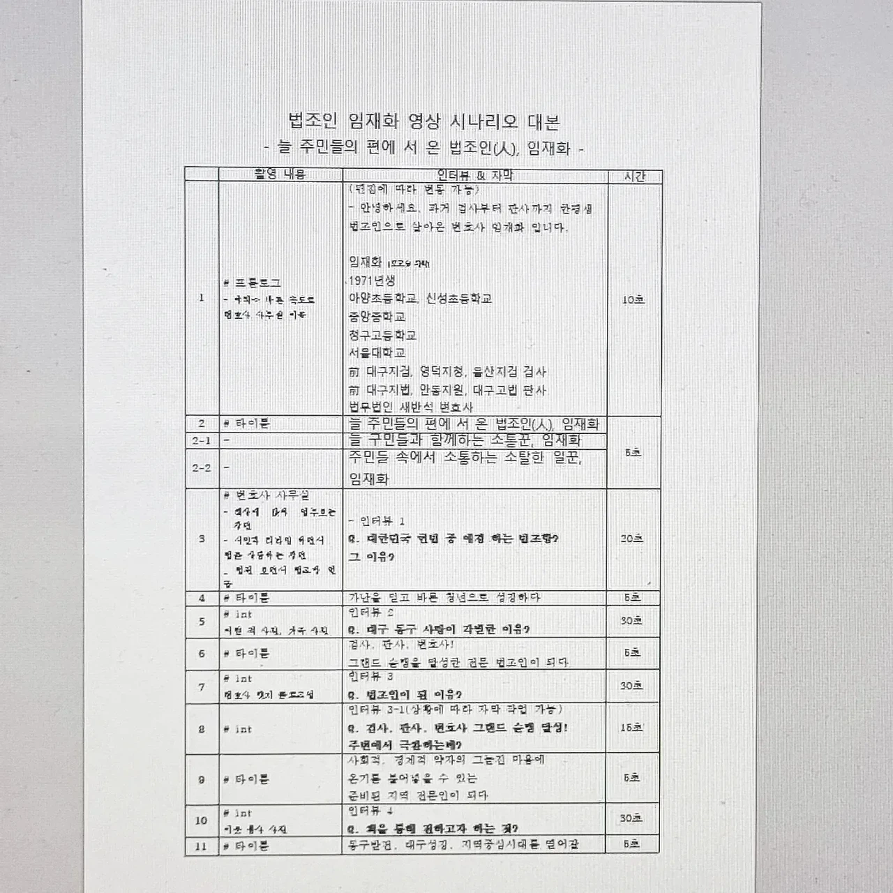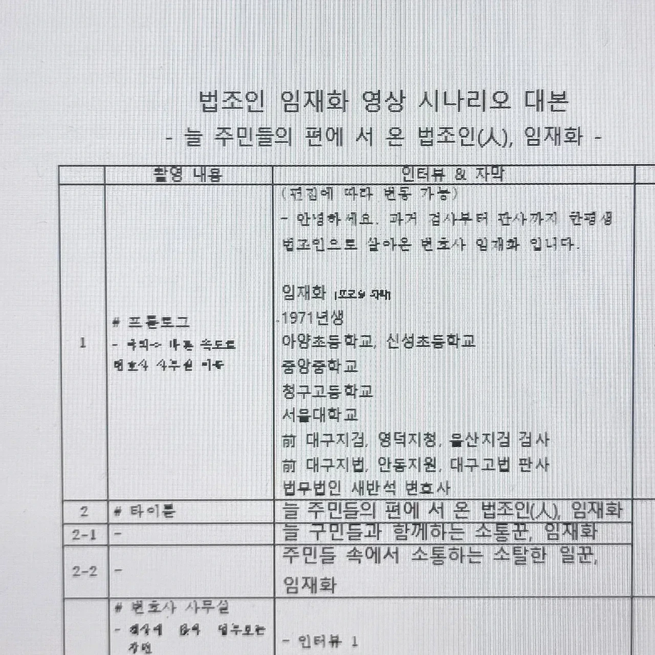 - 변호사 임재화 님의 출판기념회 영상 시나리오 대본을 마감했다. 책을 읽고 자료 써칭하고 작업할 때마다 차갑기보다 뜨거운 삶을 살아온 그의 삶이 누군가의 삶에 온기가 되어줄거라고 믿는다.