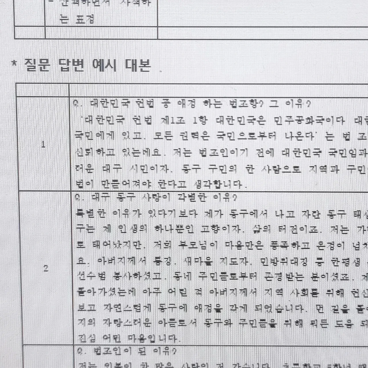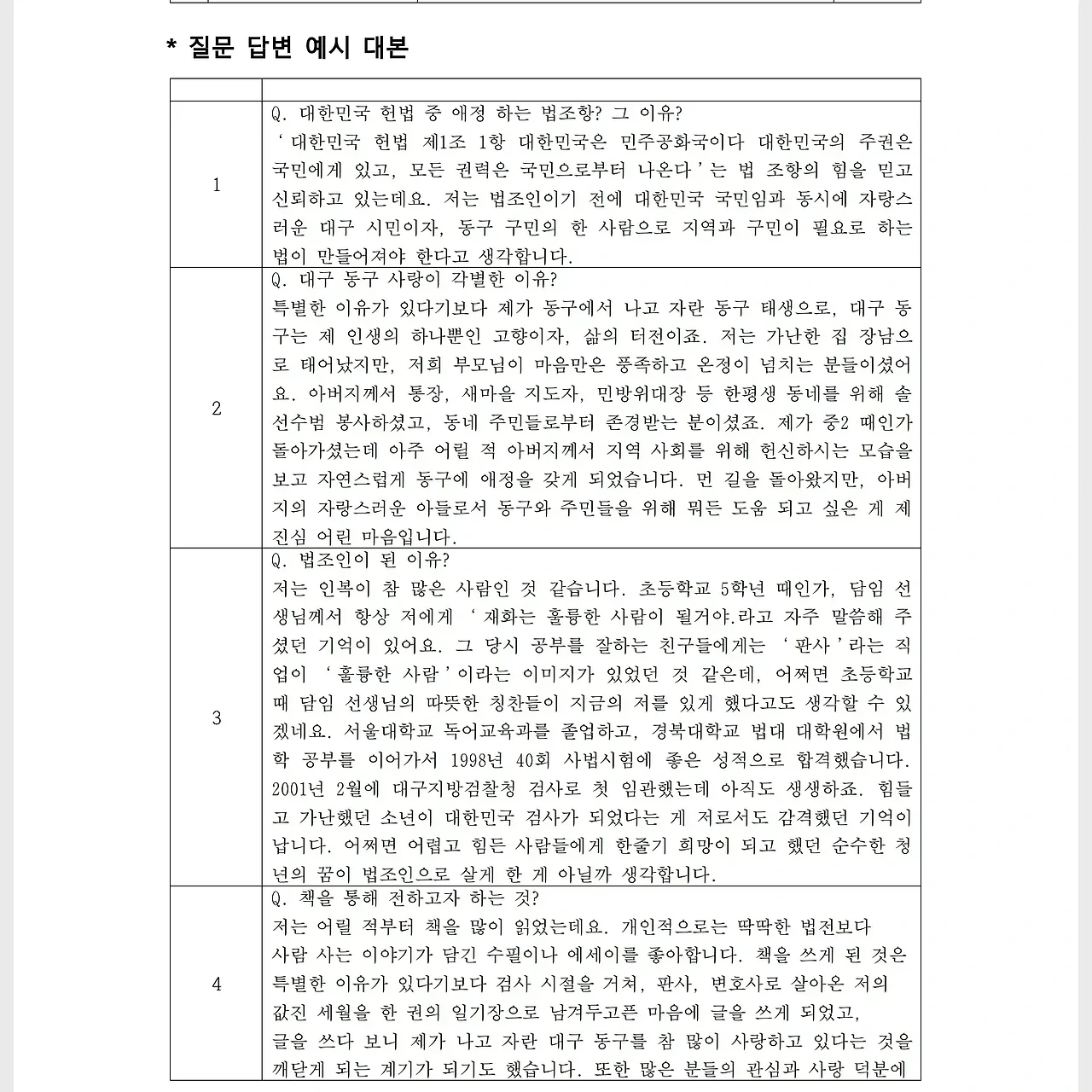 Q. 대한민국 헌법 중 애정 하는 법조항? 그 이유? ‘대한민국 헌법 제1조 1항 대한민국은 민주공화국이다 대한민국의 주권은 국민에게 있고, 모든 권력은 국민으로부터 나온다’는 법 조항의 힘을 믿고 신뢰하고 있는데요. 저는 법조인이기 전에 대한민국 국민임과 동시에 자랑스러운 대구 시민이자, 동구 구민의 한 사람으로 지역과 구민이 필요로 하는 법이 만들어져야 한다고 생각합니다.