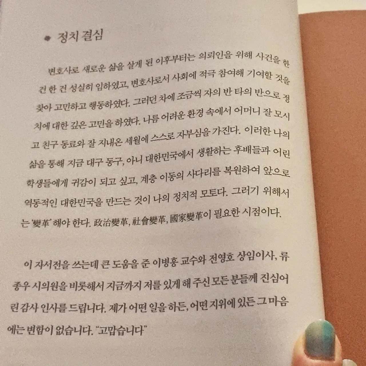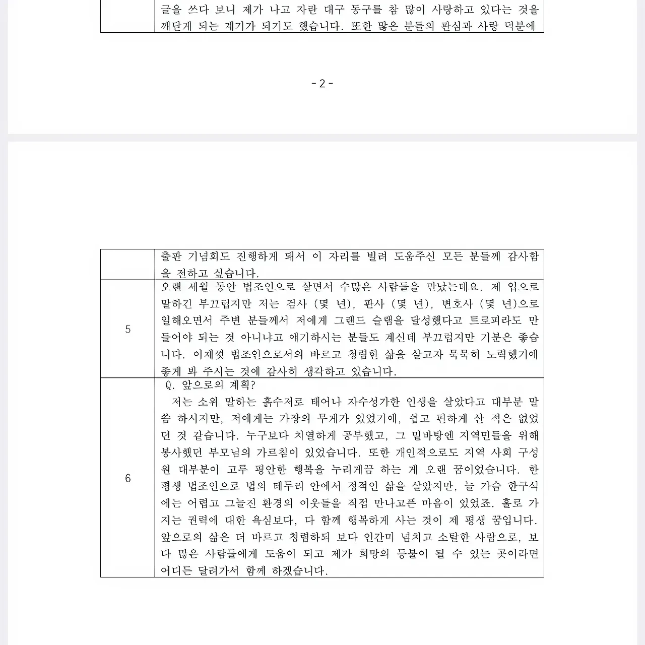 Q. 책을 통해 전하고자 하는 것? 저는 어릴 적부터 책을 많이 읽었는데요. 개인적으로는 법전보다 사람 사는 이야기가 담긴 수필이나 에세이를 좋아합니다. 특별한 이유가 있다기보다 검사 시절을 거쳐, 판사, 변호사로 살아온 저의 값진 세월을 한 권의 일기장으로 남겨두고픈 마음에 글을 쓰게 되었고, 글을 쓰다 보니 제가 나고 자란 대구 동구를 참 많이 사랑하고 있다는 것을 깨닫게 되는 계기가 되기도 했습니다. 또한 많은 분들의 관심과 사랑 덕분에 출판 기념회도 진행하게 돼서 이 자리를 빌려 도움주신 모든 분들께 감사함을 전하고 싶습니다.