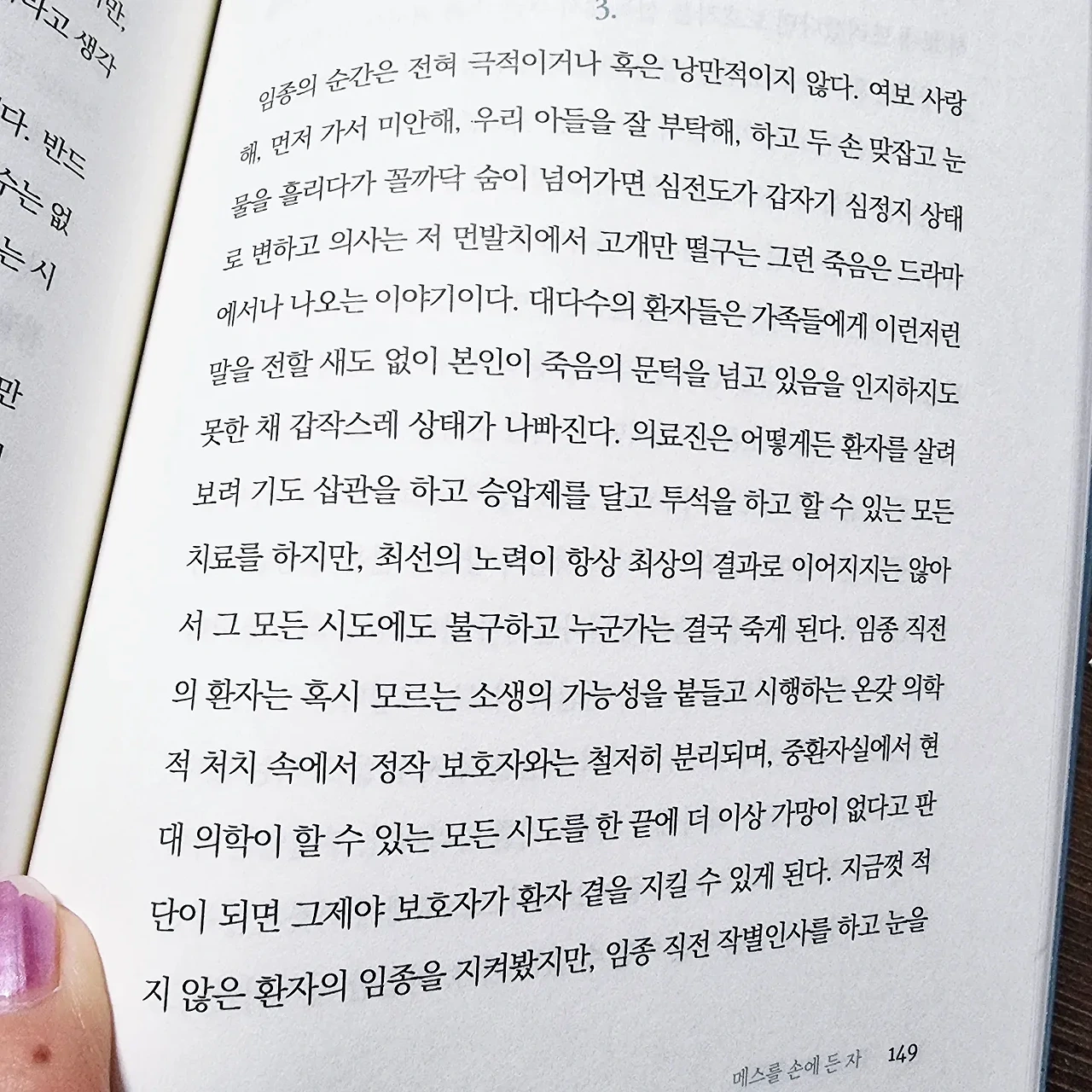 - 임종의 순간은 전혀 극적이거나 혹은 낭만적이지 않다. 여보 사랑해, 먼저 가서 미안해, 우리 아들을 잘 부탁해, 하고 두 손을 맞잡고 눈물을 흘리다가 꼴까닥 숨이 넘어가면 심전도가 갑자기 심정지 상태로 변하고 의사는 저 먼발치에서 고개만 떨구는 그런 죽음은 드라마에서나 나오는 이야기다. 대다수의 환자들은 가족들에게 이런저런 말을 전할 새도 없이 본인이 죽음의 문턱을 넘고 있음을 인지하지도 못한 채 갑작스레 상태가 나빠진다. 의료진은 어떻게든 환자를 살려보려 기도 삽관을 하고 승압제를 달고 투석을 하고 할 수 있는 모든 치료를 하지만, 최선의 노력이 항상 최상의 결과로 이어지지는 않아서 그 모든 시도에도 불구하고 누군가는 결국 죽게된다. 임종 직전의 환자는 혹시 모르는 소생의 가능성을 붙들고 시행하는 온갖 의학적 처치 속에서 정작 보호자와는 철저히 분리되며, 중환자실에서 현대 의학이 할 수 있는 모든 시도를 한 끝에 더 이상 가망이 없다고 판단이 되면 그제야 보호자가 환자의 곁을 지킬 수 있게 된다. P.149