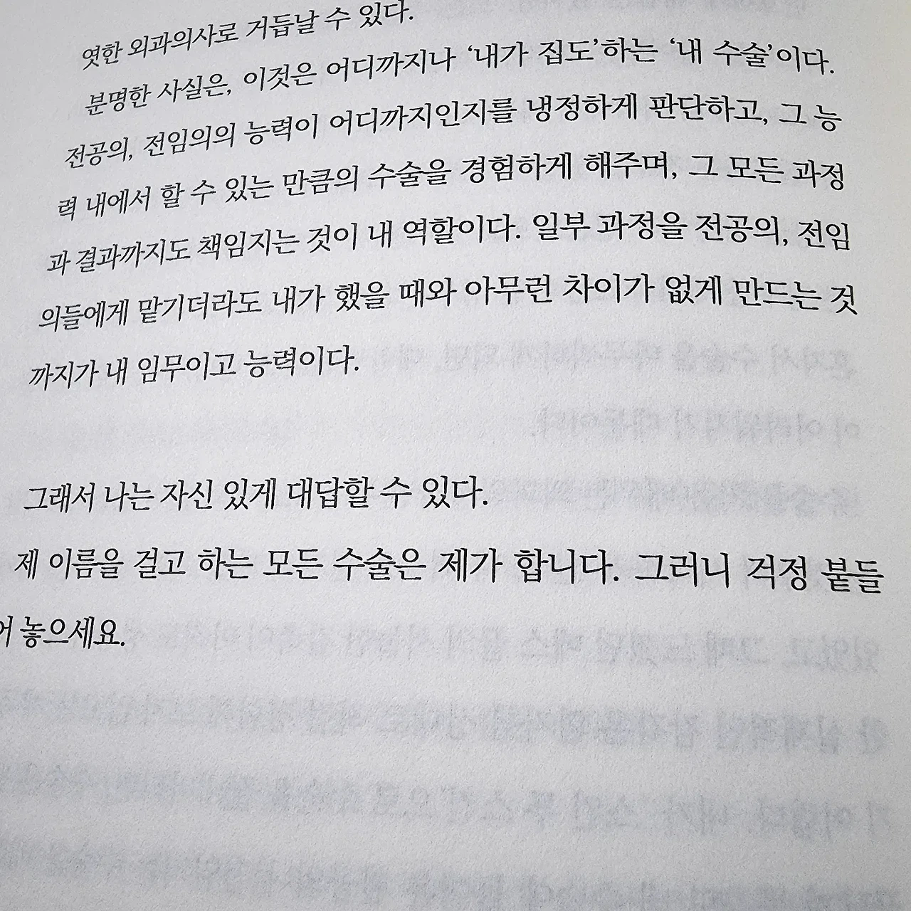 - 분명한 사실은, 이것은 어디까지나 ‘내가 집도’하는 ‘내 수술’이다. 전공의, 전임의의 능력이 어디까지인지를 냉정하게 판단하고, 그 능력 내에서 할 수 있는 만큼의 수술을 경험하게 해주며, 그 모든 과정과 결과까지도 책임지는 것이 내 역할이다. 일부 과정을 전공의, 전임의들에게 맡기더라도 내가 했을 때와 아무런 차이가 없게 만드는 것까지가 내 임무이고 능력이다. 그래서 나는 자신 있게 대답할 수 있다. 제 이름을 걸고 하는 모든 수술은 제가 합니다. 그러니 걱정 붙들어 놓으세요. - p.220