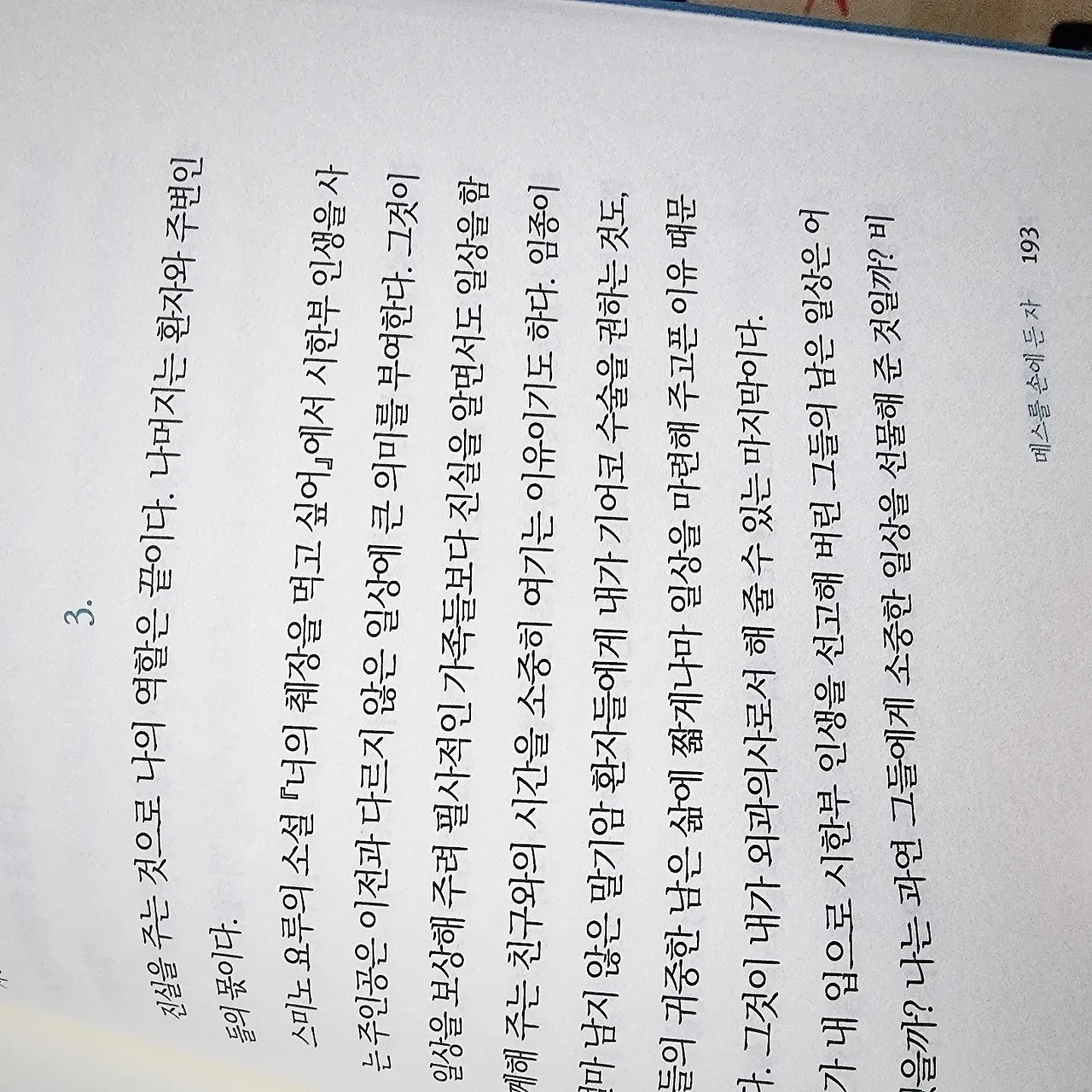 진실을 주는 것으로 나의 역할은 끝이다. 나머지는 환자와 주변인들의 몫이다. 스미노 요루의 소설 <너의 췌장을 먹고 싶어>에서 시한부 인생을 사는 주인공은 이전과 다르지 않은 일상에 큰 의미를 부여한다. 그것이 일상을 보상해 주려 필사적인 가족들보다 진실을 알면서도 일상을 함께해주는 친구와의 시간을 소중히 여기는 이유이기도 하다. 임종이 얼마 남지 않은 말기암 환자들에게 내가 기어코 수술을 권하는 것도, 그들의 귀중한 남은 삶에 짧게나마 일상을 마련해주고픈 이유때문이다. 그것이 내가 외과의사로서 해 줄수있는 마지막이다. - p.193