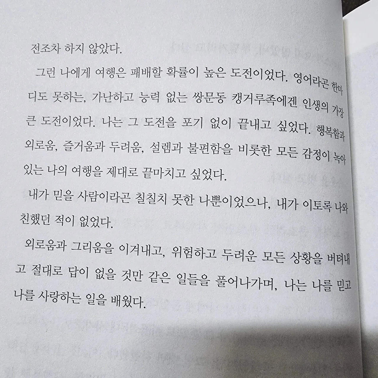 - 외로움과 그리움을 이겨내고, 위험하고 두려운 모든 상황을 버텨내고 절대로 답이 없을 것만 같은 일들을 풀어나가며, 나는 나를 믿고 나를 사랑하는 일을 배웠다. - p.64