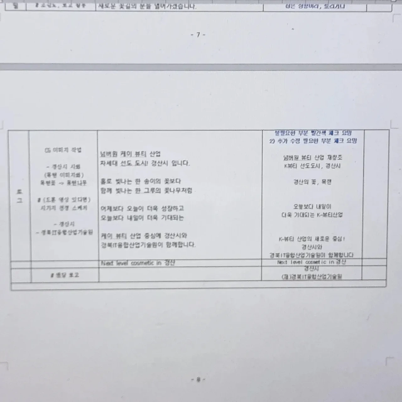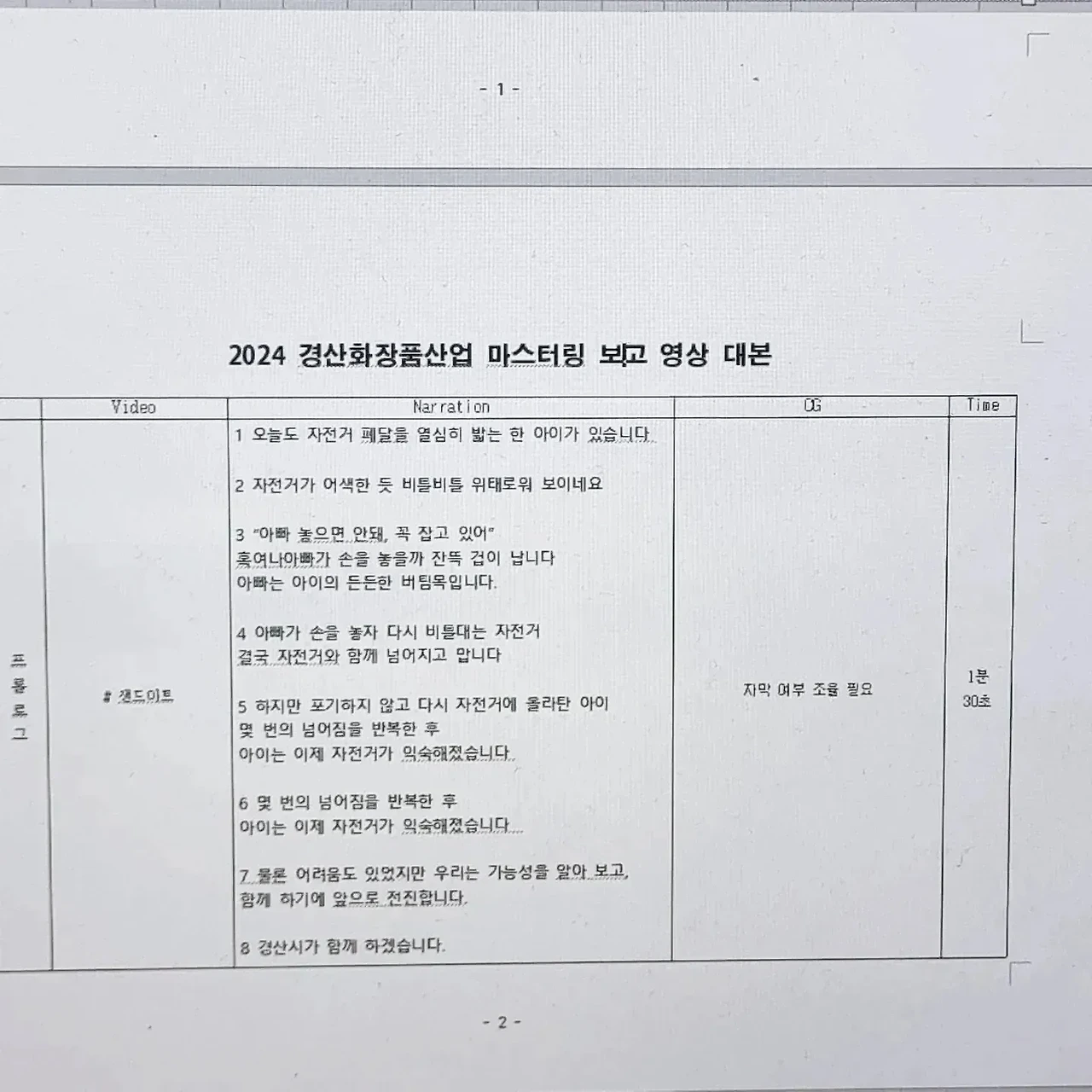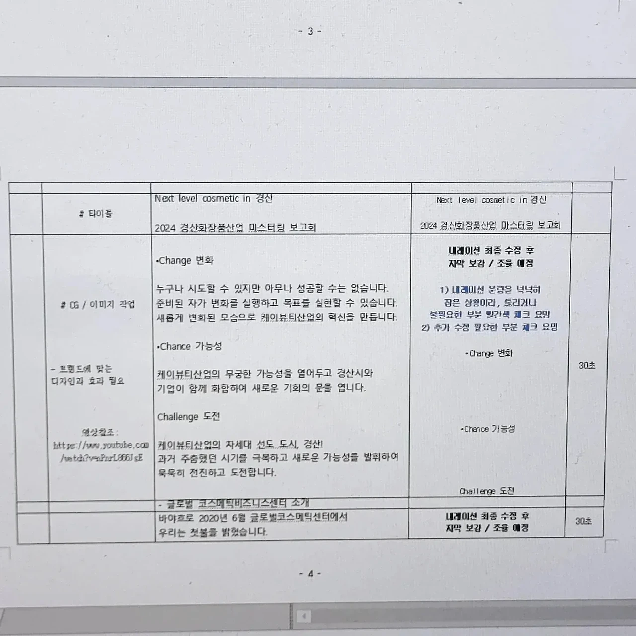 - 이른 새벽, 경산화장품뷰티산업 마스터링 보고회 영상 대본 1차 작업을 마감했다. 제작 미팅 때는 4분-5분을 예상했으나, 샌드아트와 영상 편집 분량을 생각해서 내레이션을 넉넉히 작업했다. 방송대본이든 기업광고 시나리오든 혹시 모를 수정 작업 시엔 모자란 것 보다, 넉넉한 편이 수정에 이롭다. 문장 하나 하나 가장 좋은 문구를 만들기 위해 국어사전을 검색하고 하나의 뜻도 여러개의 낱말로 표현할 수 있기에 여러번의 수정 작업을 거쳐 1차 대본 마감본이 나왔다. 마감의 기쁨은 방송대본이나 기업광고나 똑같이 세상을 다 가진듯 마음이 충만해진다. 한번에 오케이면 더없이 좋겠으나 그것은 불가능하다. 한번 본 대본보다, 두번 본 대본이 더 짜임새 있게 간결하고도 명확해진다. 대본 작업에서도 비움과 버림의 용기가 필요하다. 한번 보고, 두번 보고, 여럿이 보면 더 다채로운 참신한 아이디어나 주옥같은 문장을 창작할 수 있다. 그래서 나는 1차 대본을 감독과 연구원들한테 넘기고 피드백을 받을 예정이다. 새롭게 시도하는 샌드아트 기법도 어떤 영상이 나올지 기대가 된다. 작가에게 새벽은 늘 창작하기 좋은 시간이다. 고요하고 조용해서 집중하기 좋은 때이기에 나는 오늘도 이른 하루의 시작이 참 좋다.
