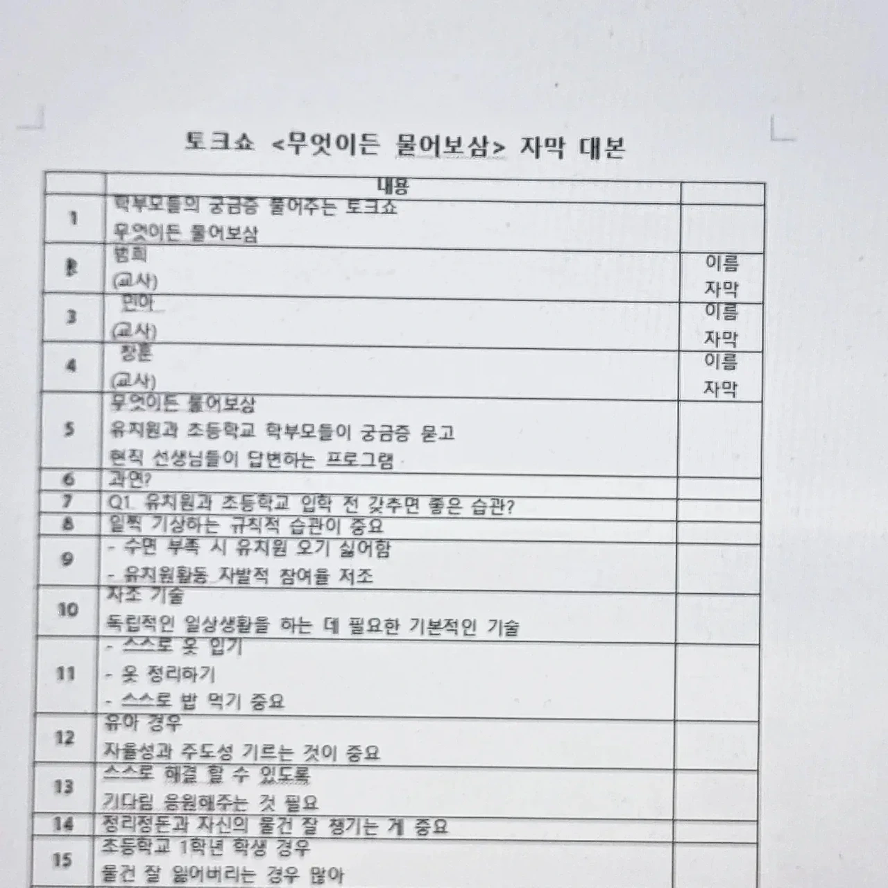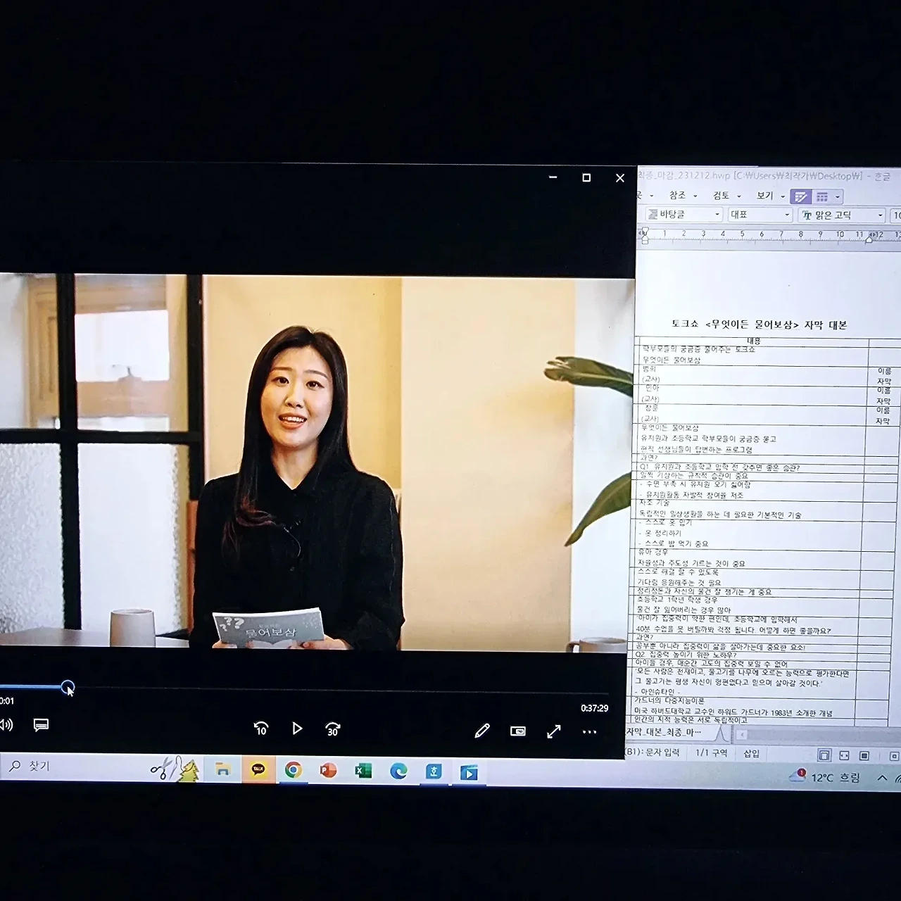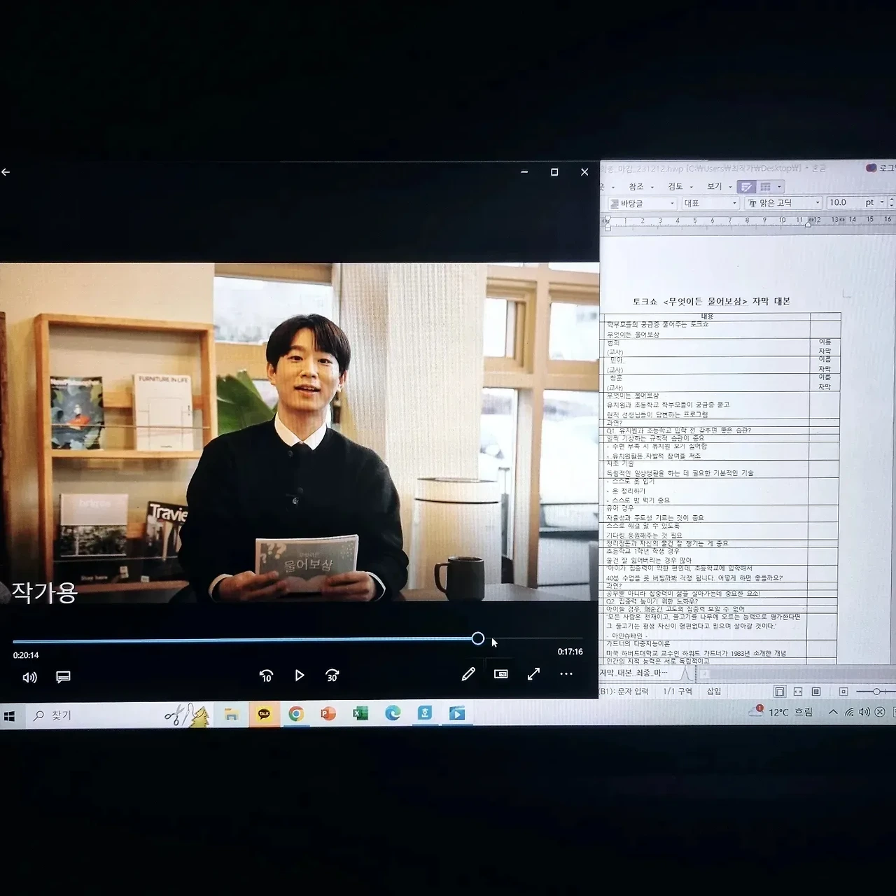며칠전 몇년동안 함께 일했던 y촬영 감독님의 전화 한통을 받았다. 40분 짜리 토크쇼 가편인데, 급히 자막 작업을 해줄수없겠냐며 부탁을 받았다. 요며칠 대본 작업이 연달아 진행되고 있어 고민했지만 토크쇼는 전문 분야라 승낙했고, 페이는 적었지만 함께한 시절의 정으로 재능기부 삼아 해드리기로 약속했다. 그리고 처음엔 자막 100개 정도만 하면 된다고 하셨으나, 촬영본과 가편 마스터본을 보면서 총 234개로 자막 대본을 마감했다. 토크쇼의 제목은 [무엇이든 물어보삼] 유치원, 초등학교 현직 교사들이 학부모의 질문에 대한 해결책을 제시하는 토크쇼인데 생각보다 분량이 길었다.(과거 토크쇼 느낌) 2명의 유치원교사와 1명의 초등학교 교사가 학부모가 남긴 질문에 답변을 달아주는 일종의 교육 토크쇼다. 현재로선 시즌1가 한 편이었고, 시즌2도 준비중이라고 한다. 유치원과 초등학교는 인생의 첫 교육기관이라고 볼 수 있는데, 학부모가 직접 궁금한 사항을 현직 교사들에게 질문하고 답변받으면서 육아 교육에 알차고 보람된 기회의 시간이 될 거라고 생각한다. 촉박한 마감 일정이지만 날 믿고 일을 부탁한 y감독님, 또 하나의 값진 경험이었어요. 막바지 편집 파이팅 입니다.