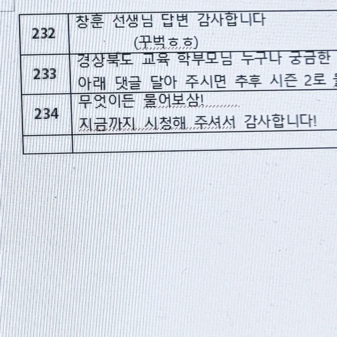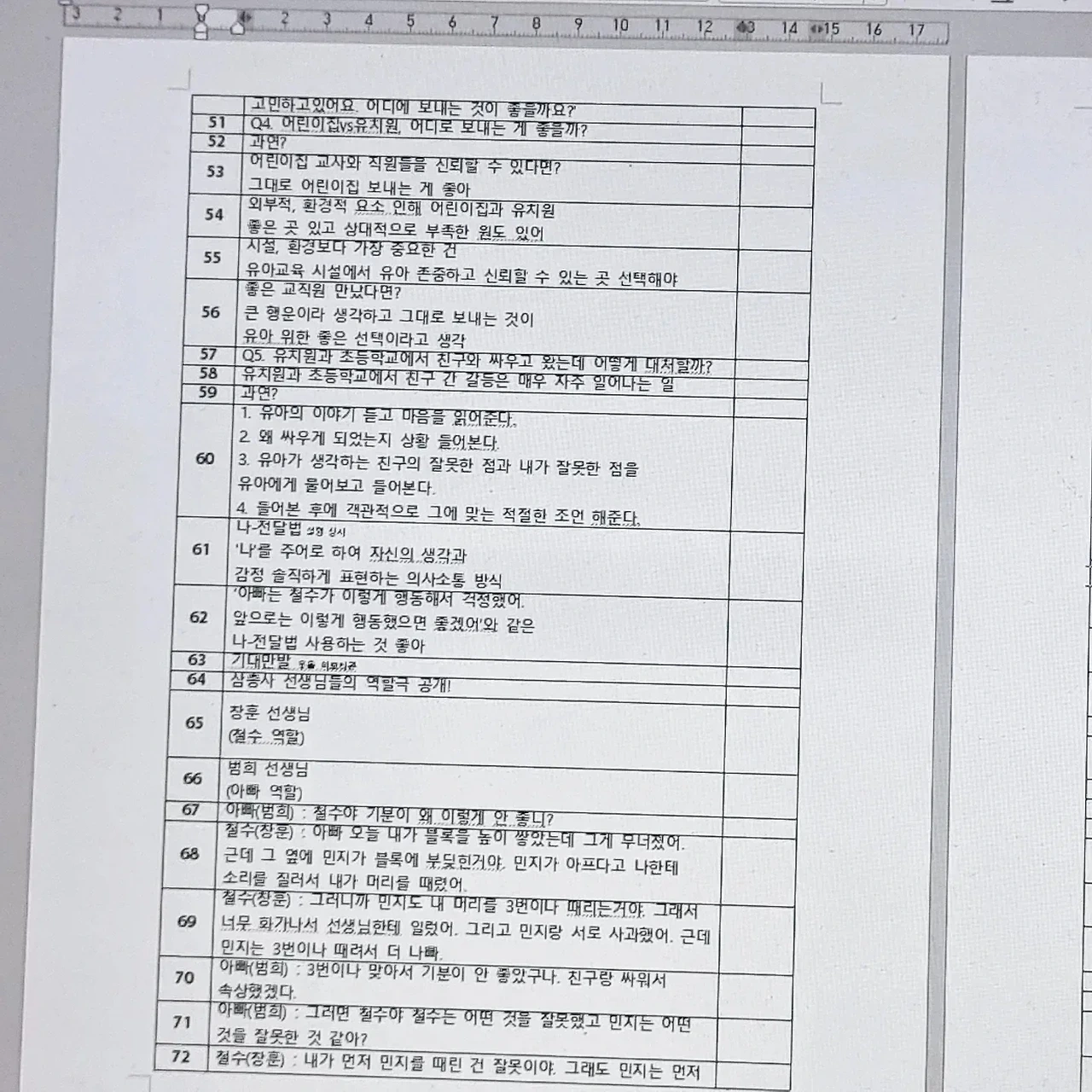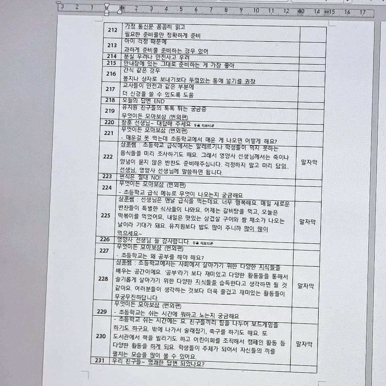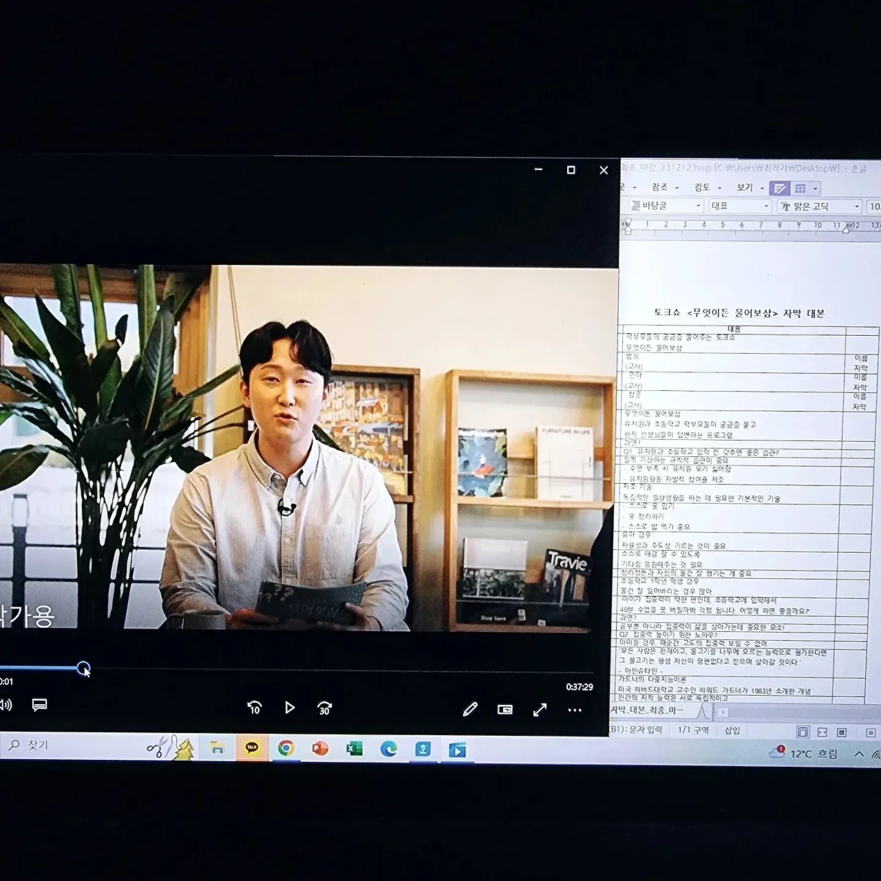 며칠전 몇년동안 함께 일했던 y촬영 감독님의 전화 한통을 받았다. 40분 짜리 토크쇼 가편인데, 급히 자막 작업을 해줄수없겠냐며 부탁을 받았다. 요며칠 대본 작업이 연달아 진행되고 있어 고민했지만 토크쇼는 전문 분야라 승낙했고, 페이는 적었지만 함께한 시절의 정으로 재능기부 삼아 해드리기로 약속했다. 그리고 처음엔 자막 100개 정도만 하면 된다고 하셨으나, 촬영본과 가편 마스터본을 보면서 총 234개로 자막 대본을 마감했다. 토크쇼의 제목은 [무엇이든 물어보삼] 유치원, 초등학교 현직 교사들이 학부모의 질문에 대한 해결책을 제시하는 토크쇼인데 생각보다 분량이 길었다.(과거 토크쇼 느낌) 2명의 유치원교사와 1명의 초등학교 교사가 학부모가 남긴 질문에 답변을 달아주는 일종의 교육 토크쇼다. 현재로선 시즌1가 한 편이었고, 시즌2도 준비중이라고 한다. 유치원과 초등학교는 인생의 첫 교육기관이라고 볼 수 있는데, 학부모가 직접 궁금한 사항을 현직 교사들에게 질문하고 답변받으면서 육아 교육에 알차고 보람된 기회의 시간이 될 거라고 생각한다. 촉박한 마감 일정이지만 날 믿고 일을 부탁한 y감독님, 또 하나의 값진 경험이었어요. 막바지 편집 파이팅 입니다.